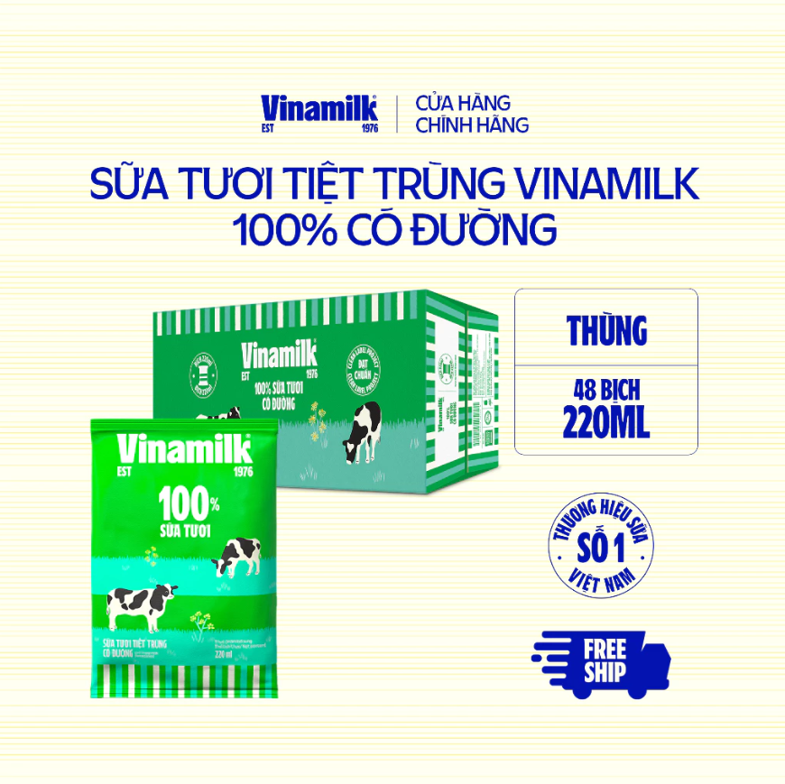 Sữa tươi tiệt trùng có đường Vinamilk 100% Sữa tươi Bịch 220ml • Được làm từ 100% sữa bò tươi nguyên chất từ những nông trại rộng lớn trải dài khắp Việt Nam, giàu