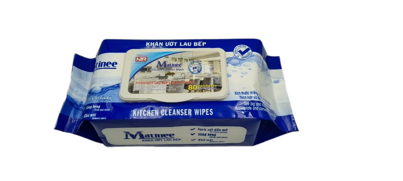 KHĂN ƯỚT LAU BẾP MATINEE Sản phẩm sử dụng hương thực phẩm phù hợp cho vệ sinh các thiết bị vật dụng trong nhà bếp. Công dụng: • Lau sạch vết dầu mỡ •