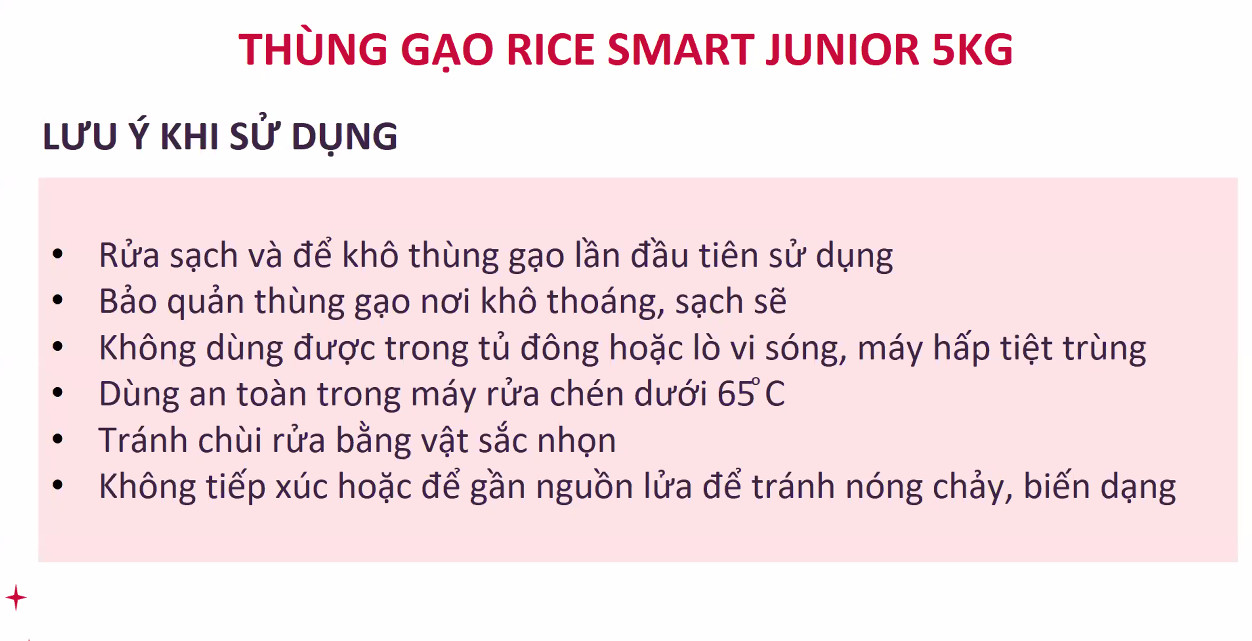 Dung tích: 5kg Kích thước: 29.4 x 19.5 x 22.8cm Nhiệt độ an toàn: 0 ~ 80⁰C   Ưu điểm và tiện ích: - Chất liệu nhựa nguyên sinh, an toàn tiếp xúc với thực phẩm - Thiết kế gọn nhẹ, phù hợp với mọi gian bếp và tiết kiệm không gian lưu trữ - Khay lấy gạo được thiết kế tinh tế giúp dễ dàng lấy gạo bằng một tay. Nguyên lý lấy gạo tuần hoàn “Vào trước – Ra trước” (First in – First out), giúp gạo trong thùng luôn tươi mới - Nắp hộp có gờ mở thuận tiện trong việc đóng, mở hộp - Thiết kế cửa sổ mặt trước nhựa trong, giúp dễ dàng nhìn thấy mức gạo được chứa bên trong.  - Thiết kế lõm hai bên hông của thùng gạo giúp an toàn cầm nắm bằng hai tay khi thùng gạo chứa đầy Công dụng: - Với dung tích nhỏ gọn 5kg, sản phẩm thùng gạo Rice Smart Junior phù hợp với việc bảo quản các loại thực phẩm như gạo, nếp, gạo lứt, hạt dinh dưỡng,… Hướng dẫn cách tháo: - Bước 1: Mở nắp thùng gạo - Bước 2: Lắp khay đựng gạo ra khỏi phần đáy - Bước 3: Lấy phần thân ra khỏi đáy - Bước 4: Lấy miếng nhựa trắng ra khỏi phần thân - Bước 5: Lấy thanh trượt ra khỏi phần đáy Hướng dẫn cách lắp: - Bước 1: Lắp thanh trượt vào phần đáy - Bước 2: Lắp khay đựng gạo vào khe ở phần đáy - Bước 3: Lắp miếng nhựa trắng vào thân - Bước 4: Lắp phần thân vào đáy - Bước 5: Cho gạo vào - Bước 6: Đậy nắp thùng gạo Cách bảo quản: - Rửa sạch và để khô thùng gạo lần đầu tiên sử dụng - Bảo quản thùng gạo nơi khô thoáng, sạch sẽ - Không dùng được trong tủ đông hoặc lò vi sóng, máy hấp tiệt trùng - Dùng an toàn trong máy rửa chén dưới 65 ͦC - Tránh chùi rửa bằng vật sắc nhọn - Không tiếp xúc hoặc để gần nguồn lửa để tránh nóng chảy, biến dạng