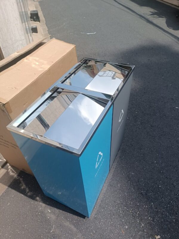 Thùng rác inox phân loại 2 ngăn A58-K, dùng để phan loại rác, được đặt tại các khu resort, tòa nhà văn phòng, nhà máy , công cộng ,khách sạn , nhà hàng,…