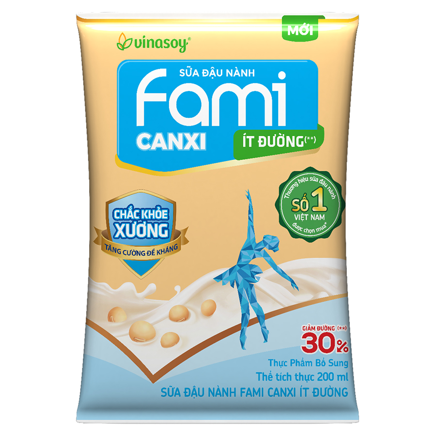Dẻo dai, đẹp dáng, khỏe xương cùng Fami Sữa đậu nành ít đường Fami Canxi bịch 200ml là sản phẩm ít đường dạng bịch 200ml tiện dụng bổ sung thêm canxi nhưng vẫn được làm