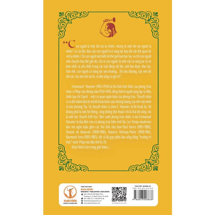 Mua tại TiktokThuyết Nhân Vị (Bìa Cứng) "“Con người là một tồn tại tự nhiên, nhưng là một tồn tại người tự nhiên” và cái độc đáo của con người là ở năng lực kép khi cắt đứt quan hệ với tự nhiên. Chỉ con người mới biết tới thế giới bao bọc họ, và chỉ con người mới chuyển hóa thế giới đó, chỉ có con người, là sinh vật có năng lực tự vệ kém nhất và yếu nhất trong các loài động vật lớn, mới làm được như vậy. Hơn thế, con người có năng lực yêu thương... Tôi yêu thương, vậy nên tôi tồn tại; vậy nên tồn tại là, và đời sống có giá trị".