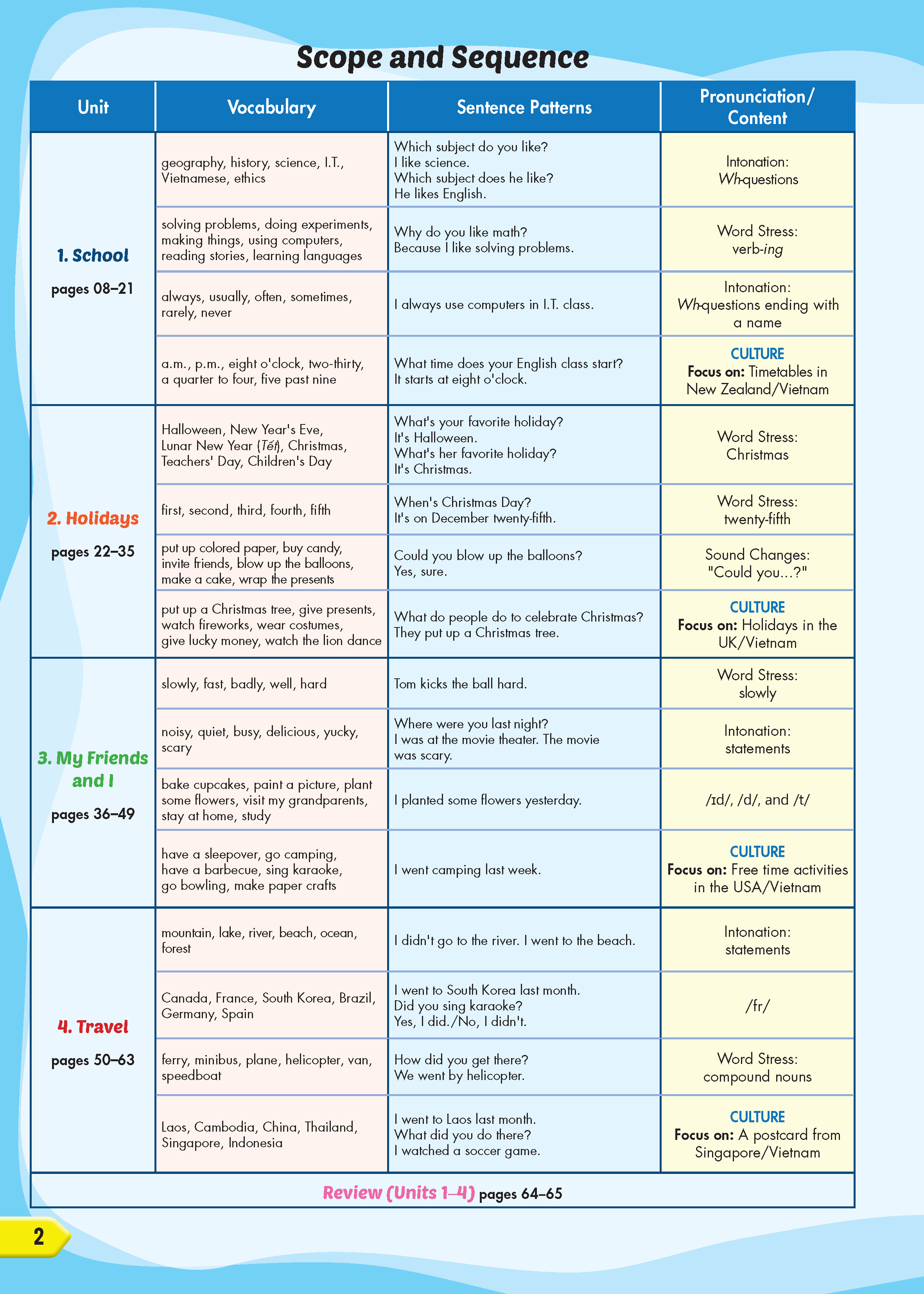 Sách: Learning English 4 - Dành Cho Học Sinh Lớp 4 NỘI DUNG VÀ CẤU TRÚC CỦA QUYỂN SÁCH : Bảng mục lục: Chỉ rõ các mục tiêu chính và trọng tâm của mỗi bài