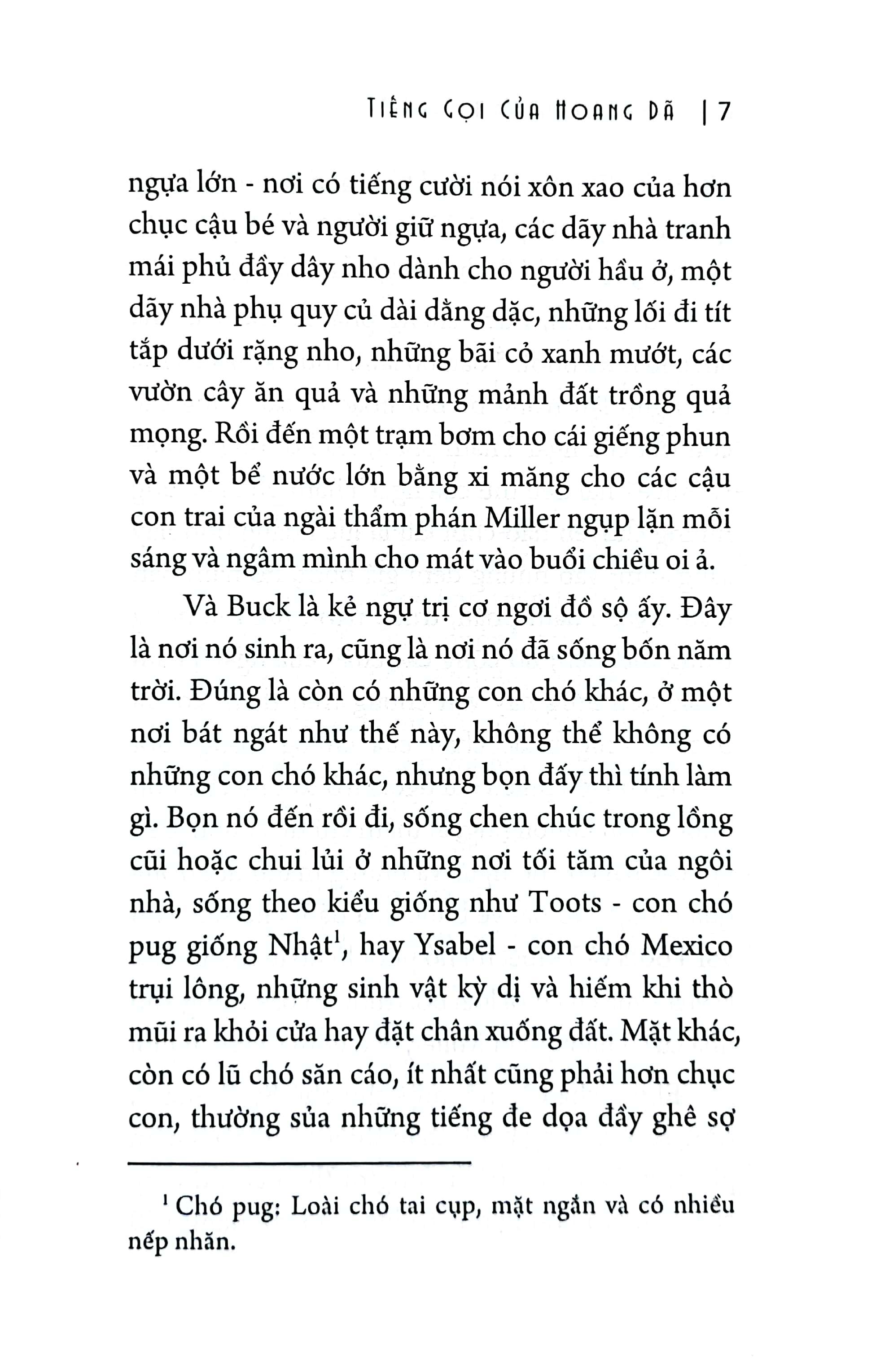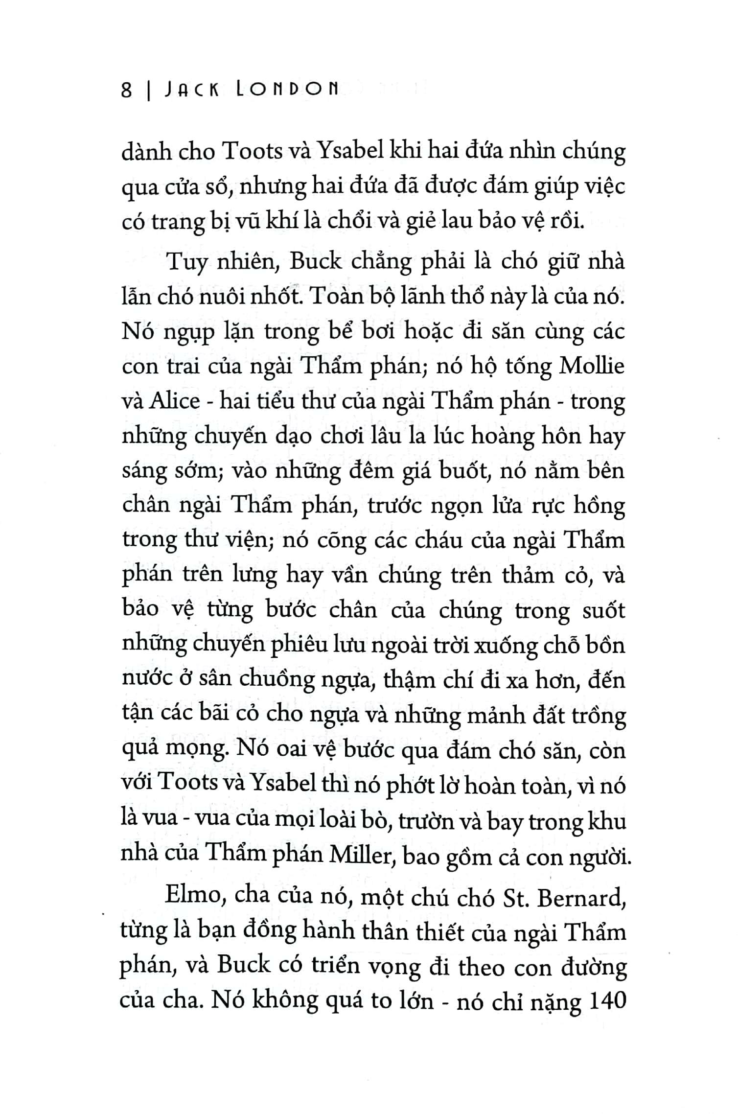 “Buck nằm đấy suốt quãng thời gian còn lại của buổi tối mệt mỏi, ôm nỗi phẫn nộ và lòng kiêu hãnh đã bị tổn thương. Nó không sao hiểu nổi tất cả mọi chuyện vừa xảy ra. Những kẻ lạ mặt kia muốn gì ở nó chứ? Sao họ lại giam giữ nó trong cái thùng thưa chật hẹp này? Nó không biết tại sao, nhưng nó cảm thấy bức bối bởi dự cảm mơ hồ về một tai họa đương lơ lửng đâu đó. Nhiều lần trong đêm, nó đứng phắt dậy khi cánh cửa căn chòi lạch cạch mở, mong thấy ngài Thẩm phán hay chí ít là các cậu chủ. Nhưng lần nào cũng là bản mặt phì nộn của tay chủ quán rượu đang nhìn chằm chằm vào nó dưới ánh sáng leo lét của ngọn nến làm từ mỡ bò. Và lần nào, tiếng sủa đầy vui mừng mới rung lên trong họng Buck cũng biến thành tiếng gầm gừ giận dữ.”