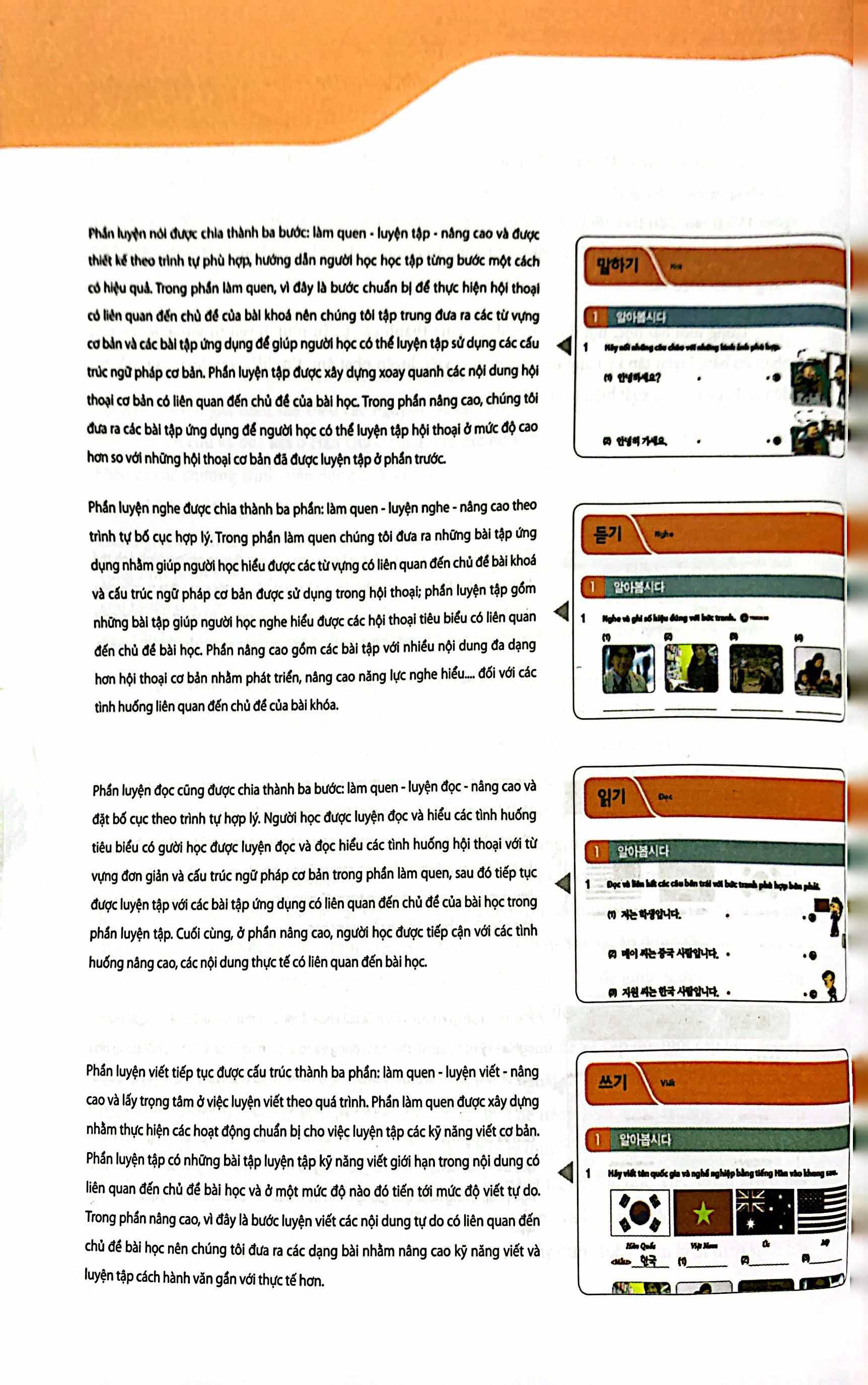 Trong mỗi bài học, nội dung học được chia thành các phần như: luyện từ vựng, luyện ngữ pháp cơ bản, luyện tập kỹ năng nghe – nói – đọc – viết, luyện phát âm, tìm hiểu văn hóa của đất nước Hàn Quốc xinh đẹp. Và kết thúc mỗi bài đều có thêm bảng từ mới xuất hiện trong bài học.