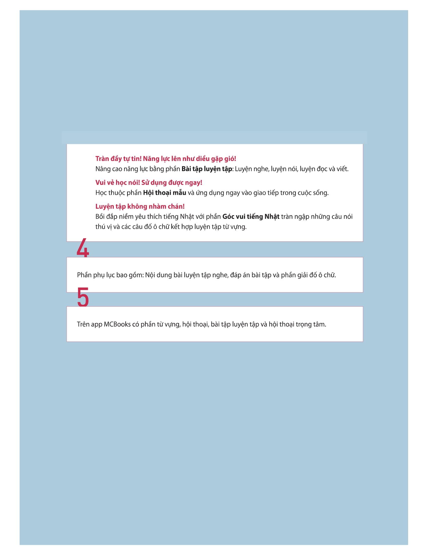 Cuốn sách này được xuất bản nhằm giúp đỡ các bạn trẻ mới bắt đầu học tiếng Nhật, hoặc những người muốn làm quen với những bài hội thoại tiếng Nhật thông dụng ở mức sơ cấp.