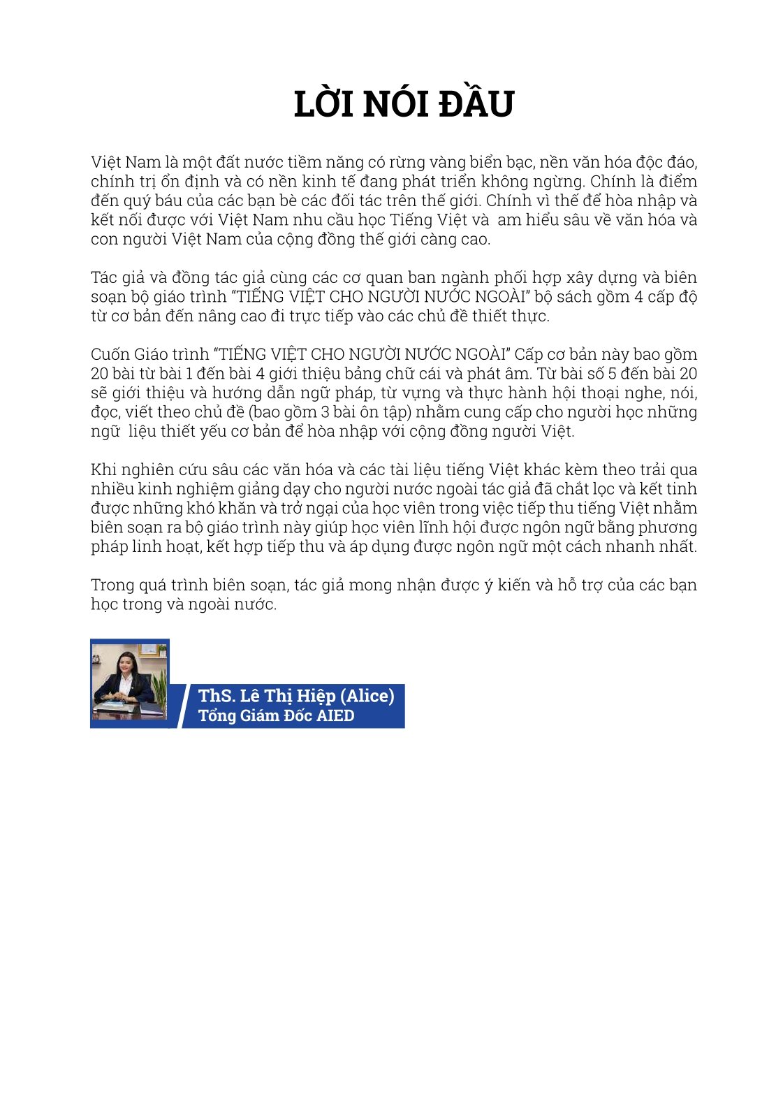 Cuốn giáo trình “Tiếng Việt cho người nước ngoài - Chương trình sơ cấp - Tái bản lần 1 ”  này có bổ sung thêm phần nội dung và hình ảnh trực quan cho người học bao quát và nắm được những ngữ liệu thiết yếu cơ bản để hòa nhập với cộng đồng người Việt. Cuốn sách gồm 20 bài, sẽ giới thiệu và hướng dẫn lần lượt về bảng chữ cái, các phát âm, ngữ pháp, từ vựng và thực hành hội thoại nghe, nói, đọc, viết theo chủ đề (bao gồm ba bài ôn tập).