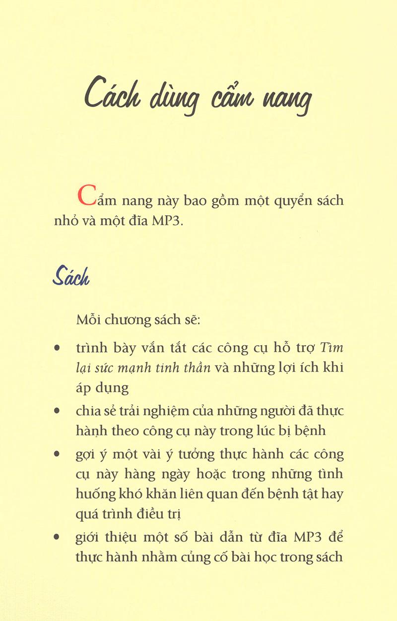 Vì vậy, Tìm lại sức mạnh tinh thần là một cẩm nang độc đáo được soạn thảo để giúp mọi người đối đầu với sự ốm đau hay thương tật. Được viết ra từ kinh nghiệm của những người trong cuộc, đã từng trải qua thử thách của những căn bệnh hiểm nghèo, sách giới thiệu bảy công cụ giúp phát triển sức mạnh nội tâm và tăng cường sức khoẻ ở mọi cấp độ. Mỗi công cụ giới thiệu những cách thực hành và khơi nguồn cảm hứng giúp bạn giải quyết những tổn thương tinh thần, thể chất, cùng nỗi hoang mang mà bệnh tật mang lại.