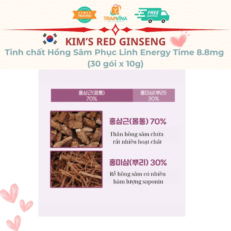 Thành phần chức năng (3gx30 gói) – hàm lượng trên 1 ngày sử dụng (9g) tổng ginsenosides Rg1, Rb1 và Rg3 là 3,6 mg Tinh chất hồng sâm (Thành phần rắn trên 60%, ginsenoside Rg1,