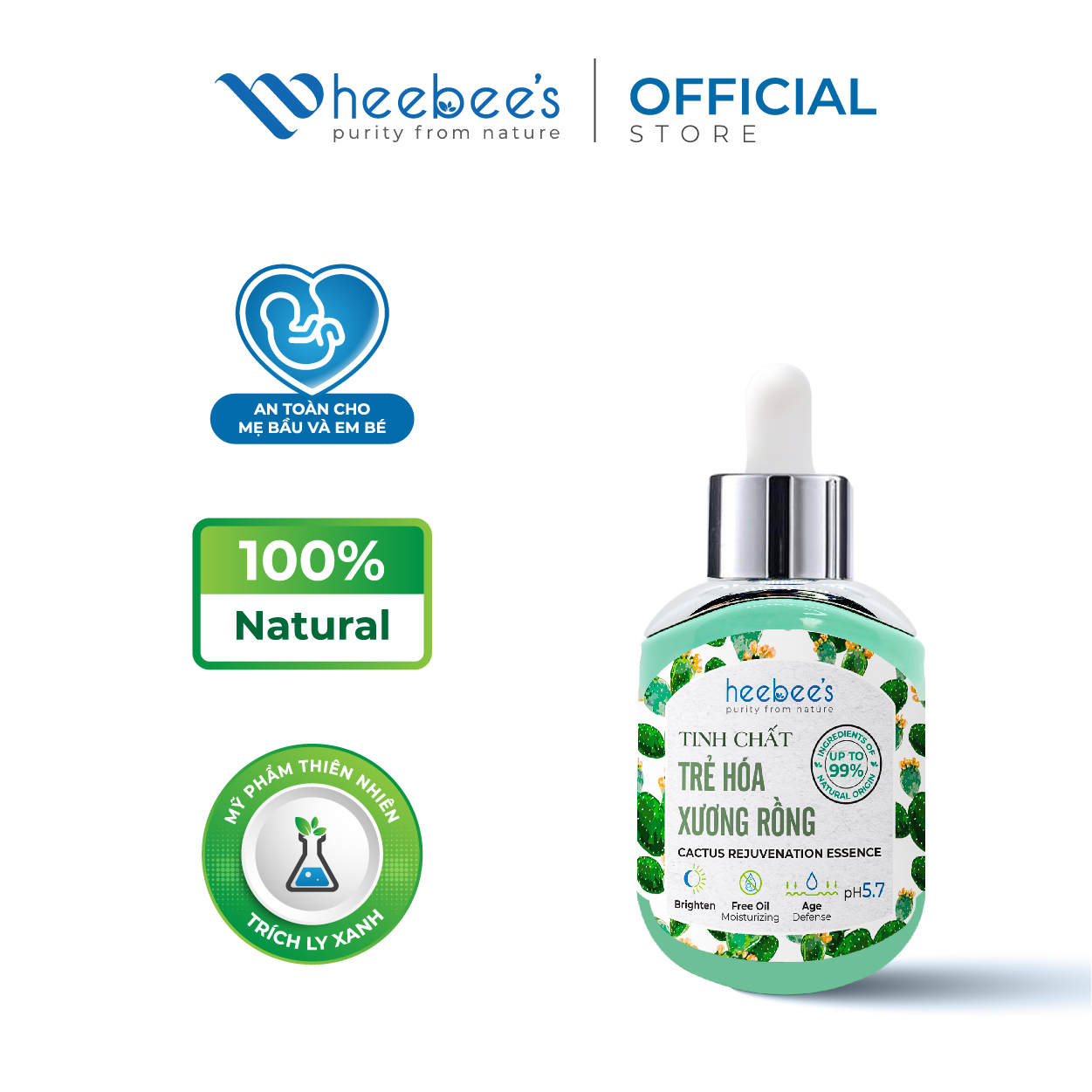 Tinh Chất Trẻ Hoá Xương Rồng Làm Trắng Da, Mịn Màng Và Căng Bóng Khai thác những tinh túy trong khả năng dưỡng ẩm và trẻ hóa da từ các loại thực vật nhiệt đới đặc trưng của Việt Nam, Tinh Chất Trẻ Hóa Xương Rồng Heebee với hàm lượng tự nhiên lên tới 99.9% là một sản phẩm giúp tái sinh làn da, sở hữu quyền năng 3in1 dưỡng trắng, dưỡng mịn căng bóng và đẩy lùi lão hóa. Công thức dưỡng Oil_free với hệ thống dưỡng thực vật tinh khiết không chứa dầu, màu xanh rêu tự nhiên từ thực vật, nhẹ êm như nước, và thẩm thấu nhanh mà không gây nặng bí hoặc nhờn rít da. CÔNG DỤNG CỦA TINH CHẤT TRẺ HOÁ XƯƠNG RỒNG Nét đột phá của sản phẩm Tinh Chất Trẻ Hoá Xương Rồng Heebee đến từ việc phát triển thành công Chiết xuất Xương Rồng với kỹ thuật siêu âm đến từ đội ngũ nghiên cứu Heebee. Xương rồng vốn là loài cây sở hữu nhiều hoạt chất chống oxy hóa và phục hồi, nhờ vào kỹ thuật trích ly công nghệ cao đã giúp thu hoạch trọn vẹn các hoạt chất thành phần chất lượng như piscidic acid, isorhamnetin... Những hoạt chất này có khả năng vượt trội trong việc thúc đẩy sự sản sinh collagen tự nhiên và cân bằng độ ẩm làn da, đồng thời tạo sự cân bằng hệ vi sinh duy trì độ ẩm thiết yếu cho làn da, đẩy nhanh quá trình làm lành các tổn thương, tăng khả năng tự bảo vệ của da trước các tác động xấu từ môi trường, sinh lý và tuổi tác, làm chậm quá trình oxy hóa da và ngăn ngừa dấu hiệu lão hóa và dưỡng da mịn màng, đều màu, trẻ trung. Hệ thống trẻ hóa của Tinh Chất nhờ vào các hoạt tính đắt giá được Heebee trực tiếp nghiên cứu và khai thác từ nguồn thực vật đặc trưng Việt Nam kết hợp cùng nguồn nguyên liệu đạt chứng nhận Hữu Cơ ECOCERT COSMO của Châu Âu, tạo nên hệ thống dưỡng da thực vật chất lượng cao giúp chống lại sự hình thành hắc tố melanin, đồng thời làm chậm quá trình oxy hóa dưới da, phục hồi và thúc đẩy tái tạo tế bào da mới một cách vượt trội và duy trì vẻ đẹp tự nhiên bền lâu. Sự kết hợp của chiết xuất Xương Rồng cùng chiết xuất từ lá Chùm Ngây tạo nên công thức đột phá chống lại các gốc tự do gây lão hóa, phục hồi làn da bị tổn thương, tăng cường hệ miễn dịch và sức sống của tế bào da trước sự xâm nhập của các gốc tự do từ môi trường hay sinh lý. Sự xuất hiện của Vitamin B5 Panthenol và chiết xuất từ cây Nha Đam giúp giúp xoa dịu các dấu hiệu kích ứng, xây dựng hàng rào bảo vệ lý tưởng cân bằng hệ vi sinh có lợi trên da và chủ động cung cấp dưỡng chất, kích thích tạo ra elastin và collagen tự nhiên cho vùng hạ bì, se mịn lỗ chân lông bằng cách lấp đầy các khoảng lồi lõm dưới da (nguyên nhân sinh ra nếp nhăn do tuổi tác). Kỹ thuật siêu âm chiết xuất lá Chùm Ngây giúp bảo toàn các flavonoid; đóng góp một lượng lớn hàm lượng vitamin C thực vật và kẽm tự nhiên dưới sự trợ dẫn tăng hoạt tính của Niacinamide, giúp tăng độ đàn hồi, tạo sự săn chắc và dưỡng trắng da một cách lành tính và hiệu quả bất ngờ. Làm sáng các vùng da xỉn màu, ngăn chặn và giảm sự hình thành các đốm nâu, nám và tàn nhang. Đồng thời giảm thiểu đáng kể tình trạng lỗ chân lông to, dư dầu nhờn hoặc bị khô ráp thiếu sức sống. Tinh Chất Trẻ Hóa Xương Rồng có kết cấu dạng gel, nhẹ, thấm nhanh mà không gây bết dính sau khi thoa, pH 5,7 ± 0.5: