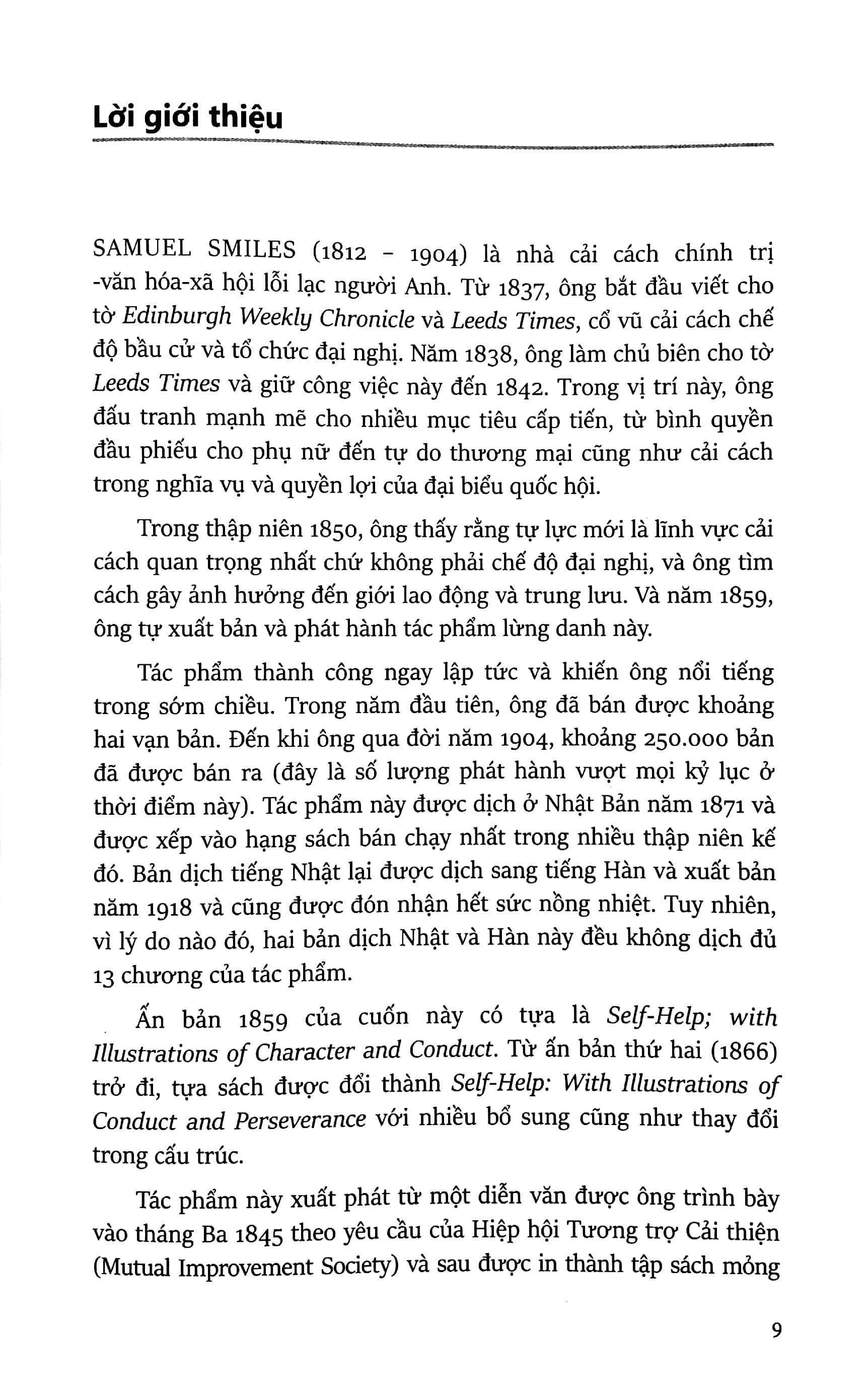 SAMUEL SMILES (1812 – 1904) là nhà cải cách chính trị-văn hóa-xã hội lỗi lạc người Anh. Từ 1837, ông bắt đầu viết cho tờ Edinburgh Weekly Chronicle và Leeds Times, cổ vũ cải cách chế độ bầu cử và tổ chức đại nghị. Năm 1838, ông làm chủ biên cho tờ Leeds Times và giữ công việc này đến 1842. Trong vị trí này, ông đấu tranh mạnh mẽ cho nhiều mục tiêu cấp tiến, từ bình quyền đầu phiếu cho phụ nữ đến tự do thương mại cũng như cải cách trong nghĩa vụ và quyền lợi của đại biểu quốc hội. Trong thập niên 1850, ông thấy rằng tự lực mới là lĩnh vực cải cách quan trọng nhất chứ không phải chế độ đại nghị, và ông tìm cách gây ảnh hưởng đến giới lao động và trung lưu. Và năm 1859, ông tự xuất bản và phát hành tác phẩm lừng danh này.