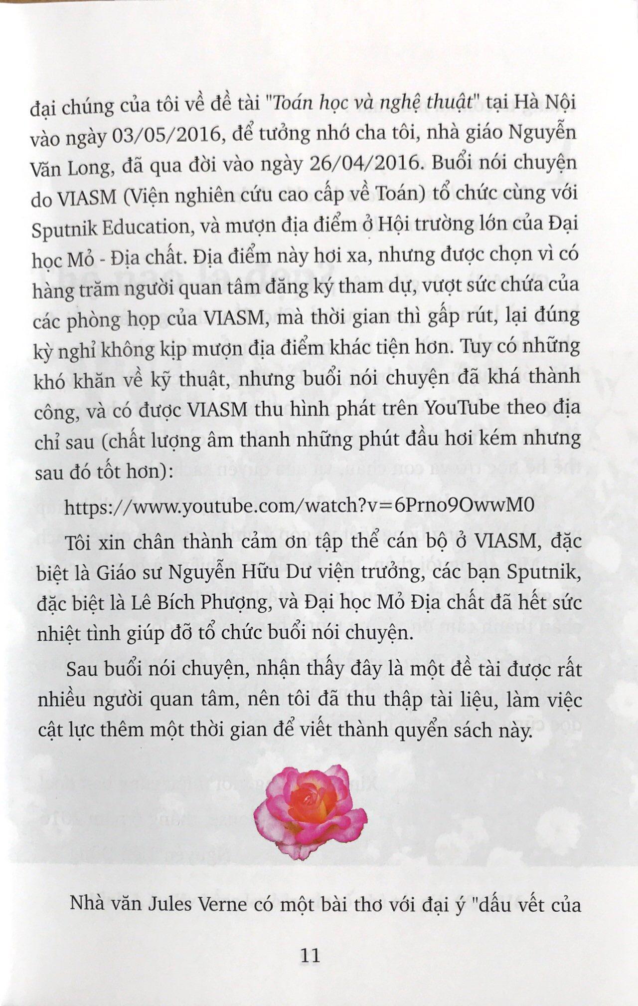 Quyển sách nhỏ này gồm tám chương, bàn về các thể loại nghệ thuật khác nhau, từ kiến trúc, hình họa cho đến âm nhạc, thơ ca, và sự liên quan với toán học. Phần lón các kiến thức về nghệ thuật cũng như về toán ỏ đây là khá cơ bản, hoặc ít ra được giải thích một cách đơn giản, sao cho học sinh phổ thông, thậm chí ỏ bậc tiểu học, cũng có thể hiểu được phần nhiều.