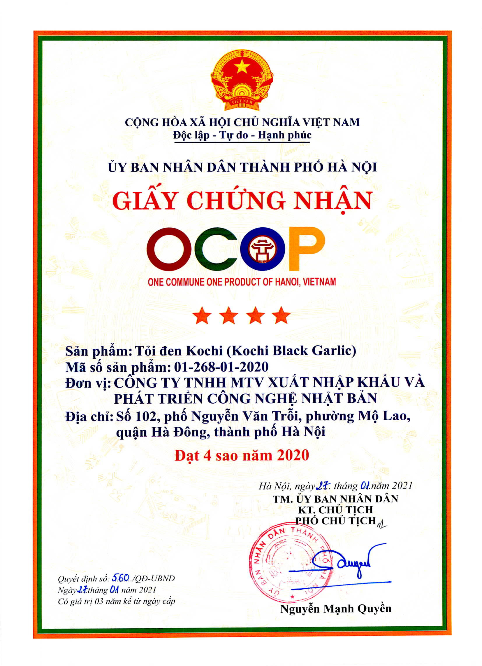 Tỏi đen Kochi đã đạt được nhiều danh hiệu uy tín như TOP 1 hàng Việt Nam được người tiêu dùng yêu thích bình chọn; Hàng Việt Nam chất lượng cao; OCOP 4 sao. Tới nay, tỏi đen Kochi đã và đang xuất khẩu nhiều nước trên thế giới như Mỹ, Thụy Sĩ, Hàn Quốc.