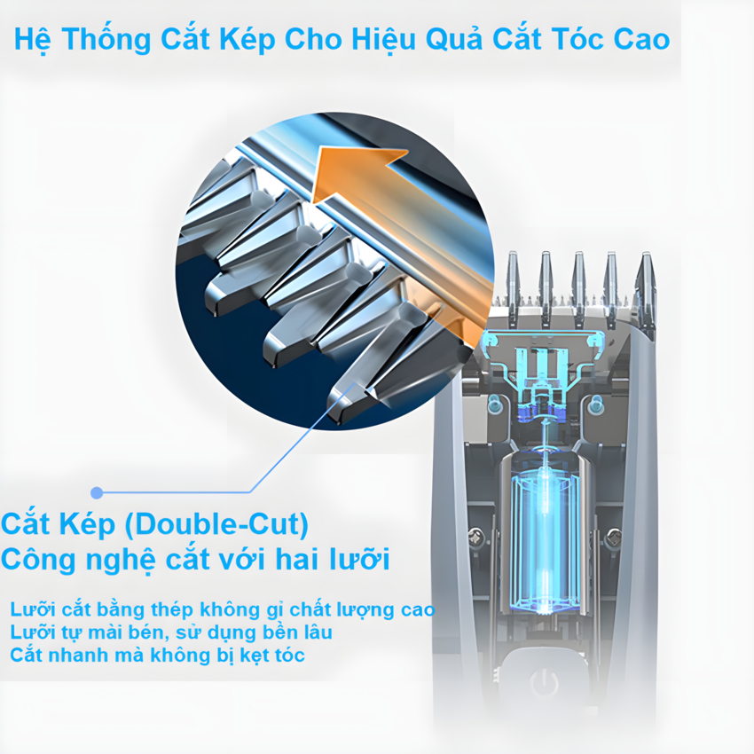 - Lưỡi dao bằng thép không gỉ, tự mài bén, đảm bảo tuổi thọ lâu dài và hiệu quả cắt sắc nét Thiết kế đầu bo tròn, bảo vệ da đầu