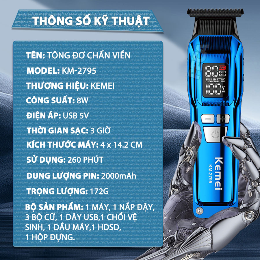 TÔNG ĐƠ CHẤN VIỀN PHIÊN BẢN CAO CẤP KEMEI KM-2795 LƯỠI MẠ CARBON DLC CAO CẤP, CÔNG SUẤT MẠNH MẼ 8W - CHÍNH HÃNG