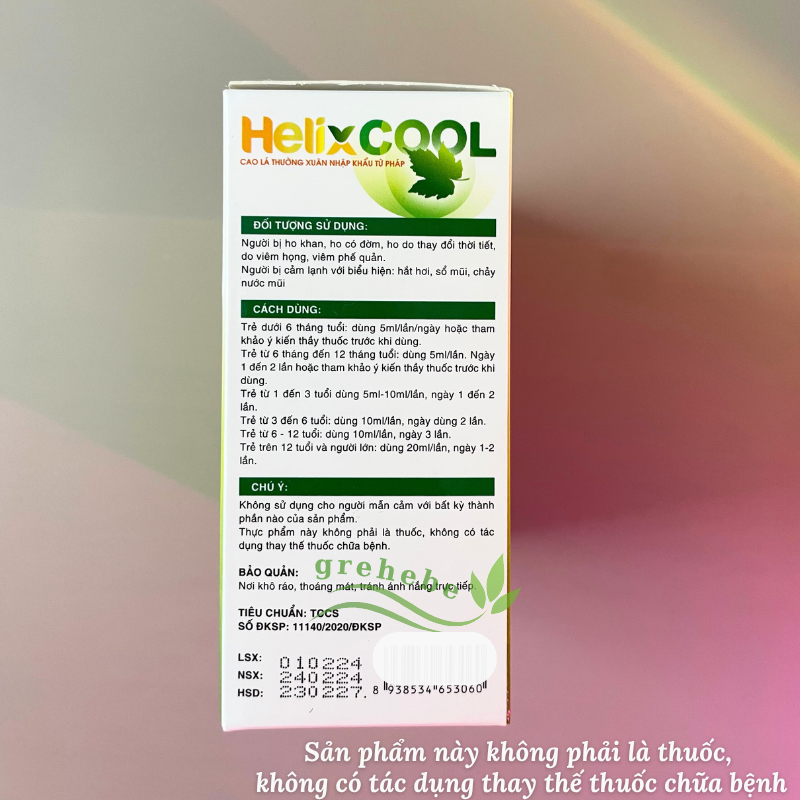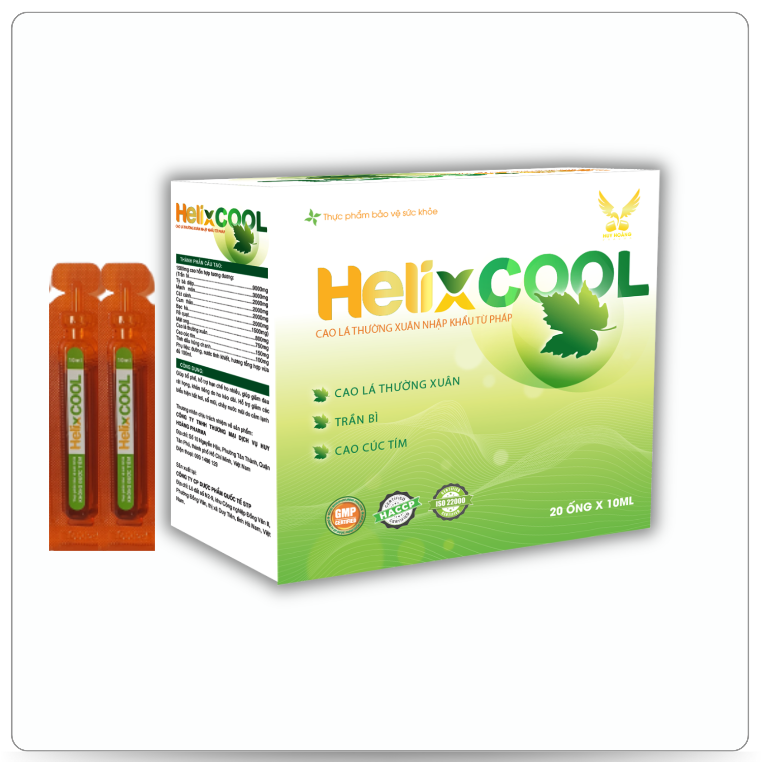 Siro ho Helix Cool chứa cao lá thường xuân nhập từ Pháp, cao cúc tím, mật ong, tỳ bà diệp, mạch môn, cát cánh,… giúp hỗ trợ bổ phế, hỗ trợ hạn chế ho nhiều, giúp giảm đau rát họng, khản tiếng do ho kéo dài; hỗ trợ giảm các biểu hiện hắt hơi, sổ mũi, chảy nước mũi do cảm lạnh.