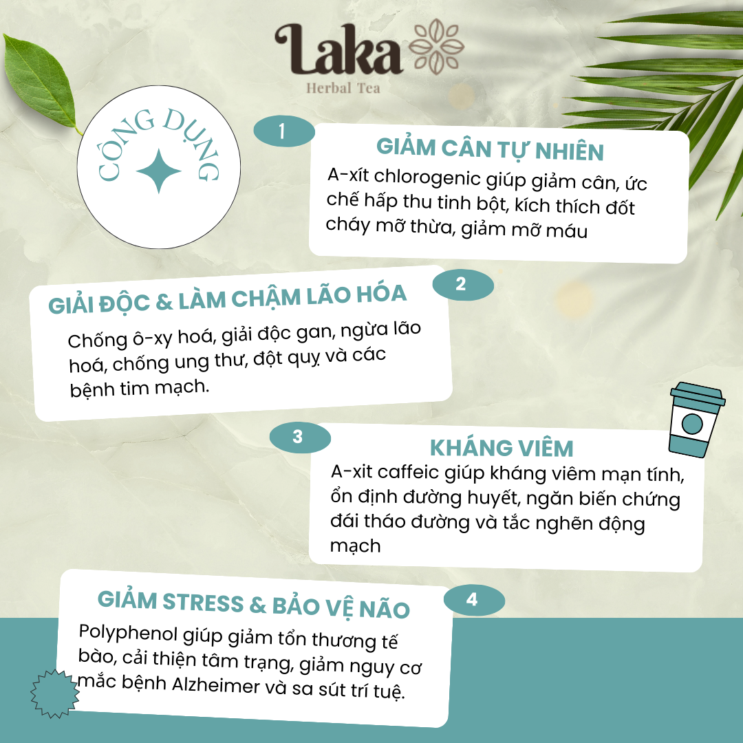 A-xít chlorogenic giúp giảm cân tự nhiên an toàn nhờ khả năng ức chế hấp thu tinh bột và quá trình tổng hợp chất béo, đồng thời kích thích đốt cháy mỡ thừa, giảm mỡ máu.