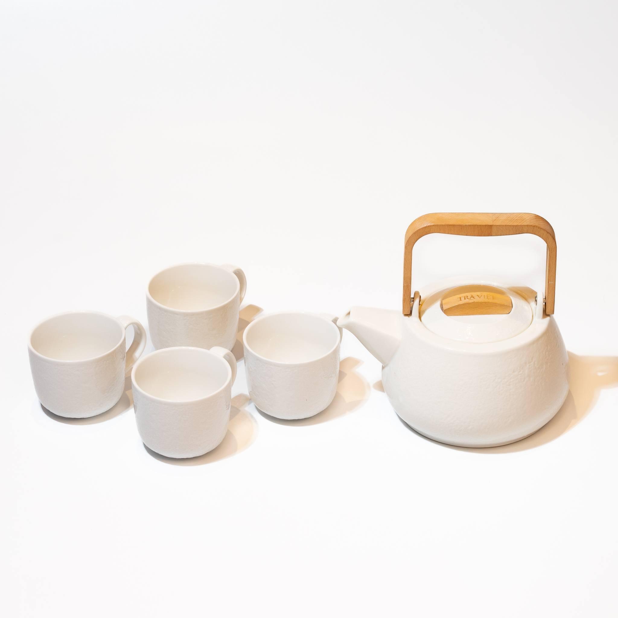 TRÀ VIỆT Bộ Quà Tặng Bộ Ấm Sứ Trắng Bách Niên Kingsize Mô tả sản phẩm: Bộ Ấm Trà Bách Niên sở hữu thiết kế hiện đại, sang trọng: -Dung tích ấm: 1,5 lít cùng