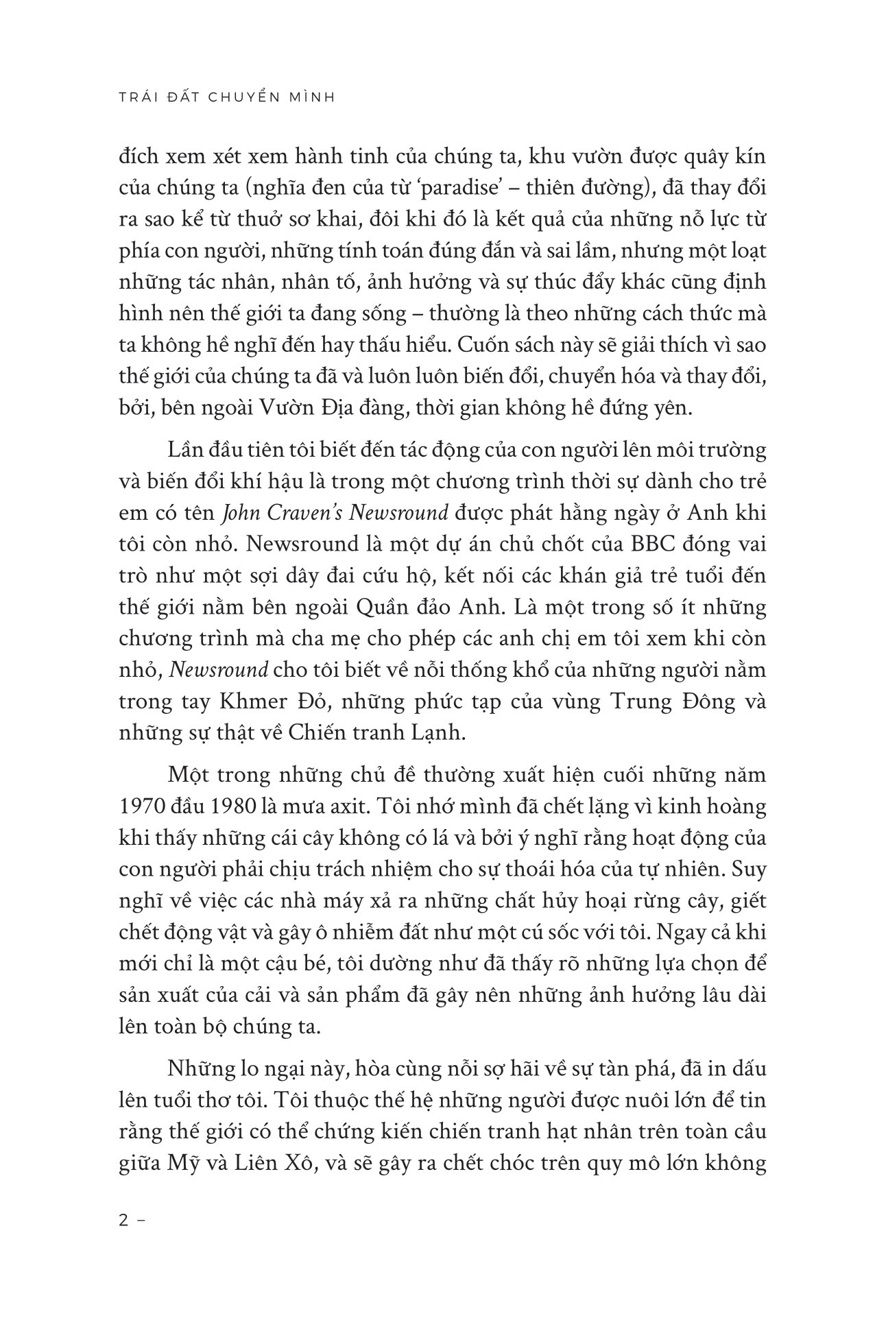 Khi nghĩ về lịch sử, chúng ta hiếm khi chú ý nhiều đến những trận lũ lụt kinh khủng nhất, những mùa đông tồi tệ nhất, những đợt hạn hán tàn khốc nhất hay cách các hệ sinh thái đã thay đổi theo thời gian. Trong “Trái đất chuyển mình”, GS Peter Frankopan đã chỉ ra rằng môi trường tự nhiên là một yếu tố quan trọng, nếu không muốn nói là yếu tố quyết định, trong lịch sử loài người và của cả lịch sử toàn cầu.