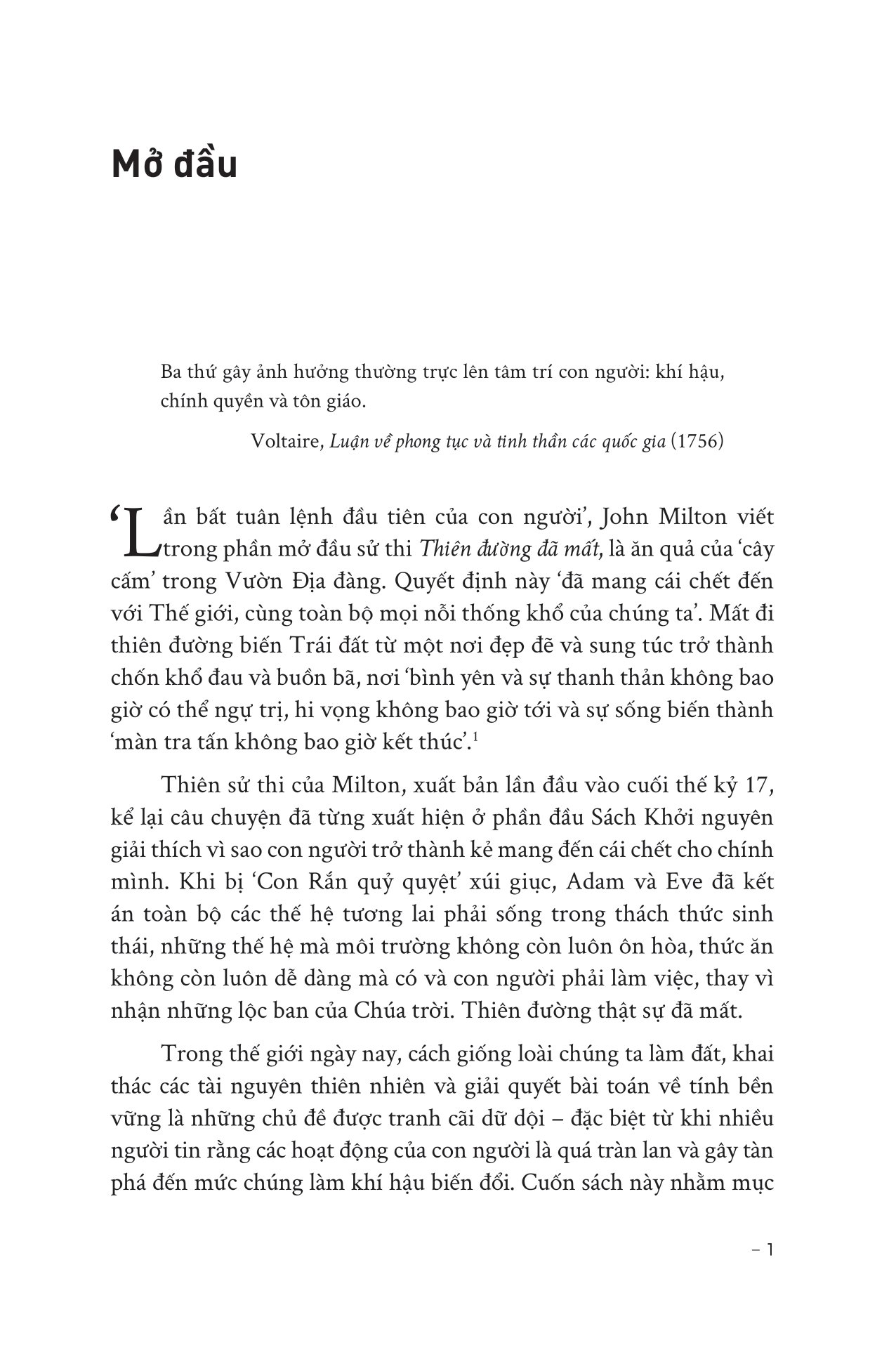- Cuốn sách này không nói về những gì sẽ diễn ra trong tương lai. Mục đích của nó không phải để thách thức những tiếng nói đồng thanh mang tính áp đảo của cộng đồng khoa học, cũng không tập trung vào các điều kiện toàn cầu hiện tại hay xem xét những bước đi nào có thể giảm thiểu một số hoặc thậm chí là nhiều vấn đề tồi tệ nhất do biến đổi khí hậu đặt ra, dẫu là qua sự thích nghi hay giới thiệu những công nghệ mới. Thay vào đó, mục đích của nó là xem xét quá khứ, hiểu và giải thích chúng ta đã ở vào vị thế mà nay có vẻ thật hiểm nghèo như thế nào.