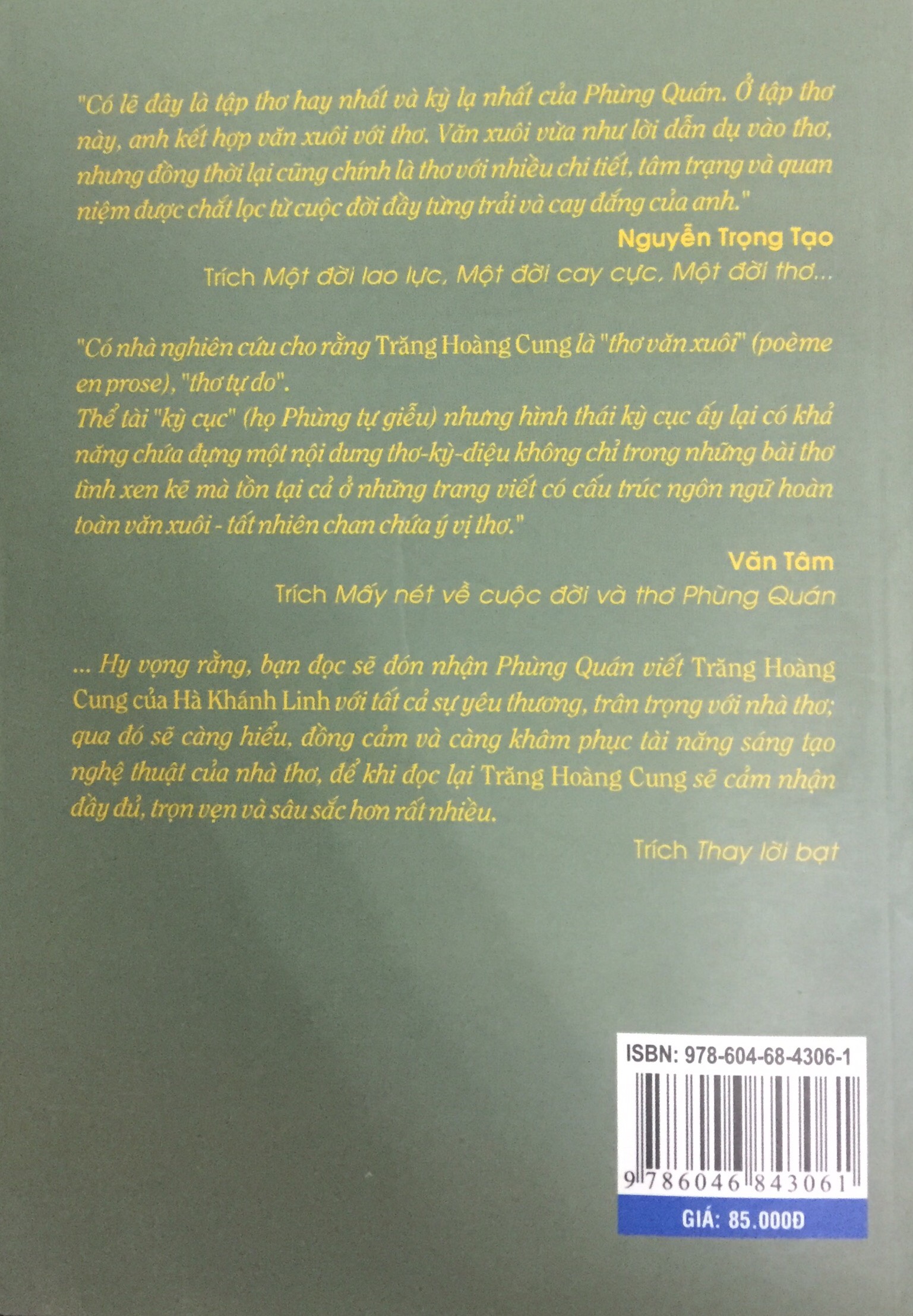 Trong lần xuất bản này, chúng tôi in kèm hồi ức Phùng Quán viết Trăng hoàng cung của nhà văn Hà Khánh Linh. Hy vọng rằng qua Phùng quán viết Trăng hoàng cung, bạn đọc sẽ biết được xuất xứ của mỗi bài thơ và hiểu sâu sắc hơn về Trăng hoàng cung. Đặc biệt, qua đó người đọc sẽ hiểu được thế nào là lao động sáng tạo nghệ thuật của nhà văn.
