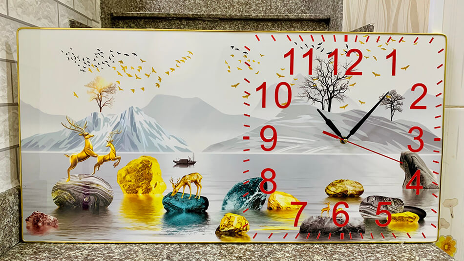 Tranh đồng hồ tráng gương hươu vàng bên đá cuội tranh đồng hồ tráng gương sẽ góp phần làm cho không gian nhà bạn trở nên sinh sinh động và tươi mới hơn.   Ưu điểm và ý nghĩa của tranh đồng hồ: tráng gương  rất phong phú về chủ đề, màu sắc, chất liệu, ý nghĩa. Bên cạnh đó, tranh đồng hồ sẽ có những loại tranh phù hợp riêng, xét về góc độ thẩm mỹ, tranh dồng hồ cho phòng khách,phòng ngủ,phòng bếp sẽ gồm những bức tranh về phong cảnh, thiên nhiên, cảnh quan tươi đẹp. Tùy vào diện tích và thiết kế của căn phòng. Tranh đồng hồ không chỉ để xem giờ mà còn  giúp không gian căn phòng thư thái,dễ chịu,giúp cho căn nhà của bạn tràn đầy sức sống,tinh thần thoải mái sau những giờ làm việc căng thẳng. Căn nhà là tổ ấm của gia đình, căn nhà bạn sẽ thật là đẹp khi đến với chúng tôi, chỉ cần Bạn yêu thích mẫu tranh,kích thước, chúng tôi sẽ đáp ứng tối đa nhu cầu của gia đình bạn. Chất liệu và kích thước: được làm từ lọai giấy cao cấp,in ảnh chất lượng cao,không bị nhòe ảnh hay bể ảnh,cán lớp mica tráng gương bóng bảo vệ chịu nước và chống bay màu tốt,đem lại cho bạn một sản phẩm không chỉ độc đáo về hình ảnh mà còn tốt về chất lượng.Sản phẩm được làm từ những lọai gỗ mịn cao cấp nhập khẩu từ nước ngoài (gỗ MDF), phủ melamine có tính chống trầy cao,không biến dạng. Kích thước chi tiết:                              30x60cm                              40x80cm                              50x100cm                               60x120cm
