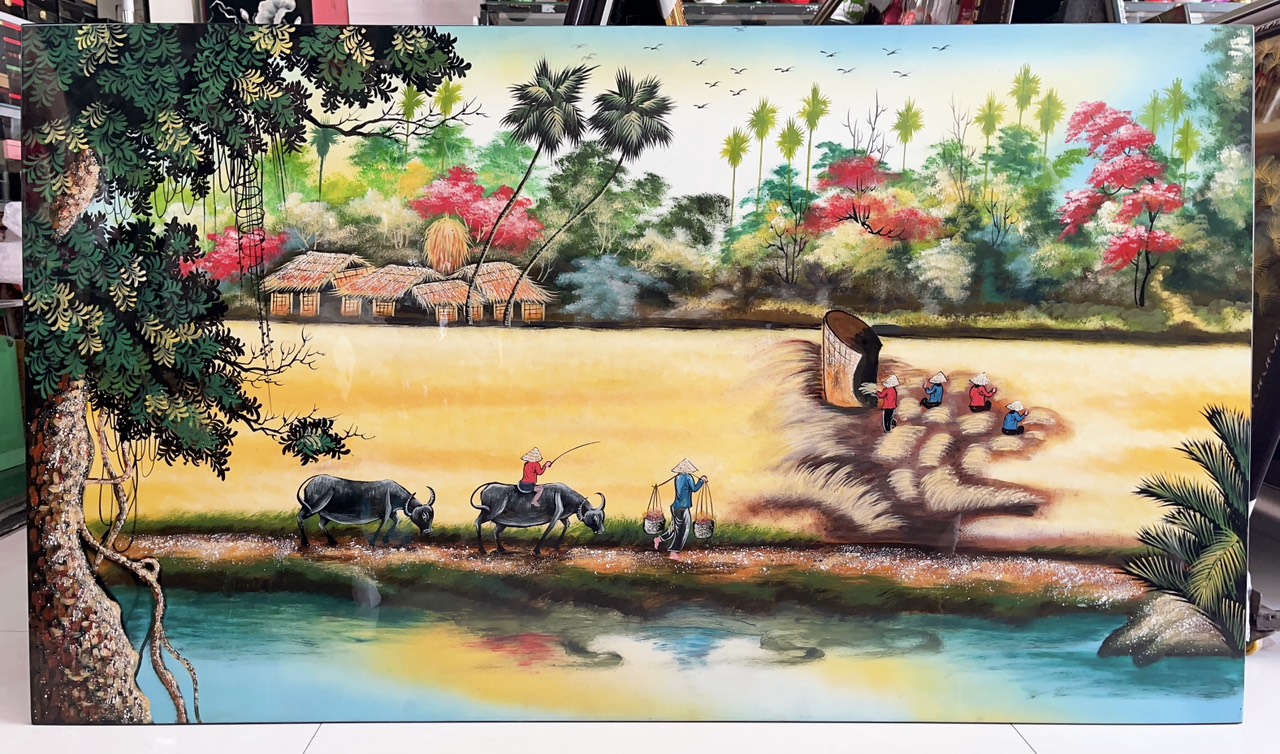 Tất cả tranh sơn mài được sử dụng màu vẽ, sơn PU với chất lượng tốt giúp tranh luôn giữ được màu vẽ, độ bóng bền vững theo thời gian. Đồng quê Việt Nam luôn là nguồn cảm hứng bất tận của những người nghệ sĩ yêu quê hương. Những cánh đồng lúa bạt ngàn, những con người lao động chân chất nhưng cần cù chịu thương chịu khó là những nét đẹp của đất nước trong mắt nhân dân và bạn bè quốc tế.