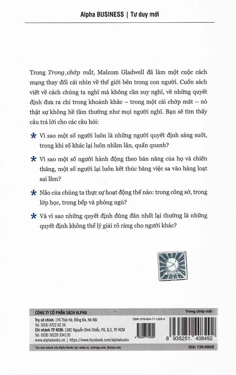 Trong Chớp Mắt là một cuốn sách chiến lược viết về sức mạnh của việc nghĩ mà không cần suy nghĩ, về những quyết định đưa ra chỉ trong một cái chớp mắt thực sự không hề tầm thường như mọi người vẫn nghĩ. Vì sao một số người luôn là những người quyết định sáng suốt, trong khi số khác lại luôn lầm lẫn, quẩn quanh… Tại sao một số người hành động theo bản năng của họ và chiến thắng, một số người lại luôn kết thúc bằng sai lầm. Não của chúng ta thực sự hoạt động thế nào: trong công sở, trong lớp học, trong bếp và phòng ngủ… Và vì sao những quyết định đúng đắn nhất lại thường là những quyết định không thể lý giải rõ ràng cho người khác.