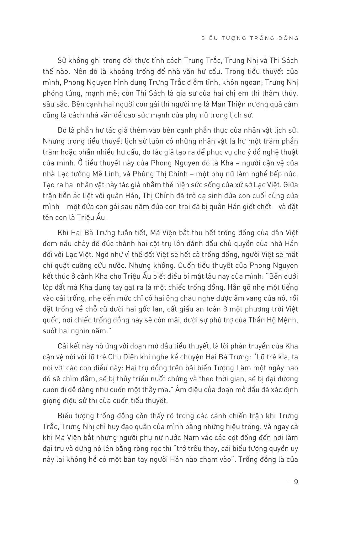 Phong Nguyen đã đặt cho cuốn tiểu thuyết của m.ình về Hai Bà Trưng cái tên Bronze Drum (Trống đồng) có lẽ là vì vậy. Hai Bà Trưng là khởi nguồn sức sống quật khởi của người đất Việt đối chọi với kẻ thù phương Bắc sẽ trở thành truyền thống dân tộc trong trường kỳ lịch sử. Trống đồng là biểu tượng của sức sống đó, truyền thống đó.
