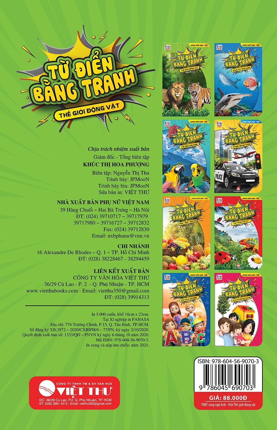 Cuốn sách “Từ điển bằng tranh – Thế giới động vật” được thiết kế dưới dạng từ điển bằng tranh (song ngữ Việt - Anh) tập hợp rất nhiều các ảnh chụp thật, rõ nét và ấn tượng về các loài vật sẽ giúp bé làm quen với thế giới xung quanh và có những từ vựng đầu tiên làm nền tảng cho giao tiếp và tư duy.