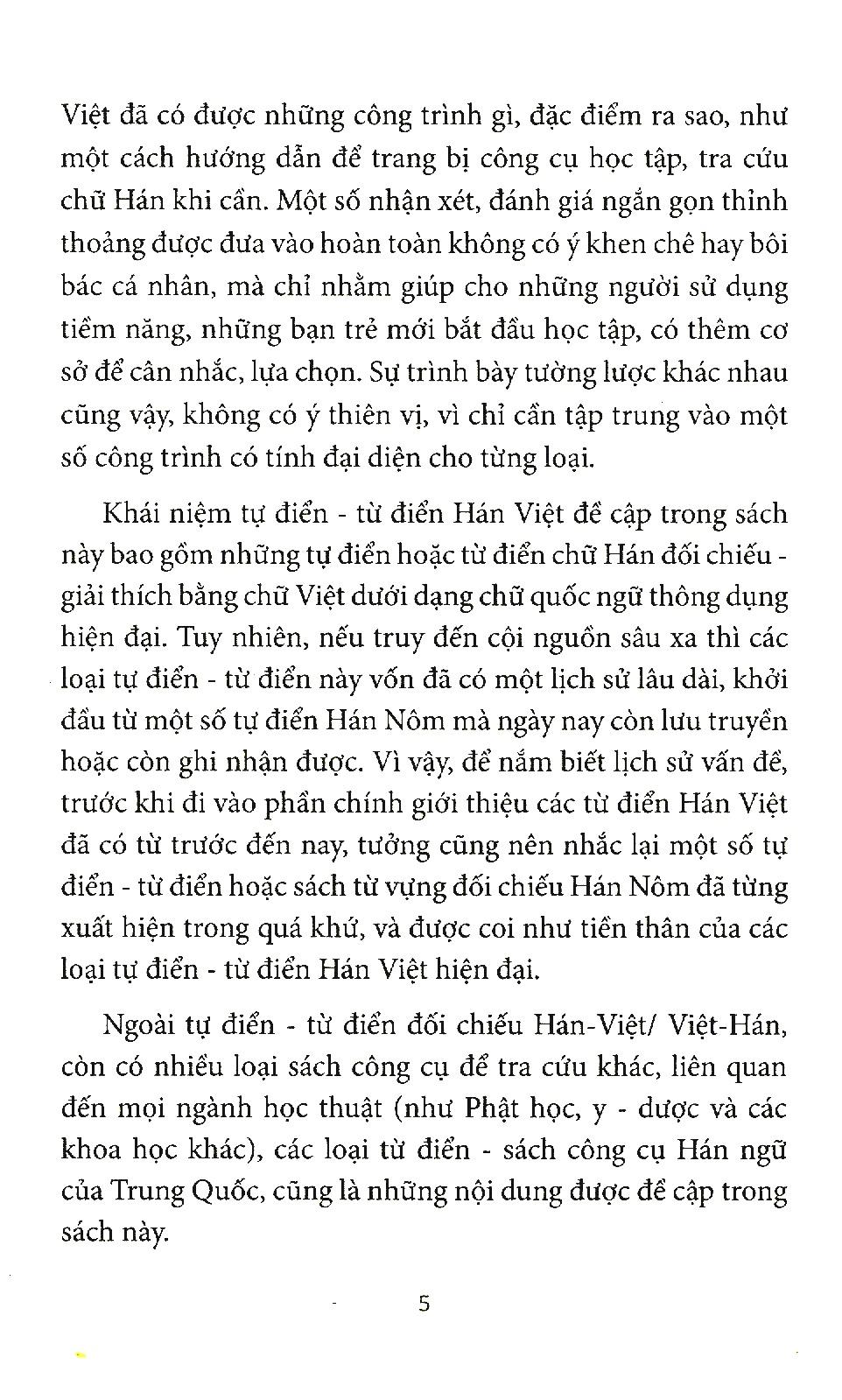 Sách sẽ điểm qua hầu như tất cả những bộ tự điển – từ điển Hán Việt đã xuất hiện ở Việt Nam từ khởi thủy cho đến hiện tại, khởi đầu từ những công trình tiên phong có trước cả hai bộ Hán Việt từ điển của Đào Duy Anh (1932) và Hán Việt tự điển của Thiền Chửu (1942); rồi lần lượt giới thiệu sơ lược theo thứ tự thời gian xuất hiện sau đó hầu hết những bộ tự điển – từ điển Hán Việt tiêu biểu đã ghi nhận được, kể từ bộ Từ điển Trung Việt của Văn Tân trở đi.
