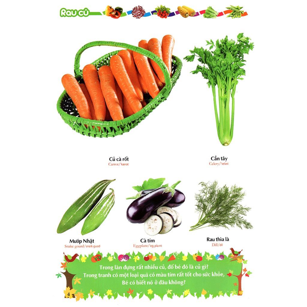 Cuốn sách với nhiều hình ảnh sinh động về các loại rau củ quả khác nhau giúp bé phát triển khả năng nhận biết. Cuốn sách còn là bộ sưu tập với nhiều hình ảnh gần gũi quen thuộc giúp bé trở nên thích thú.