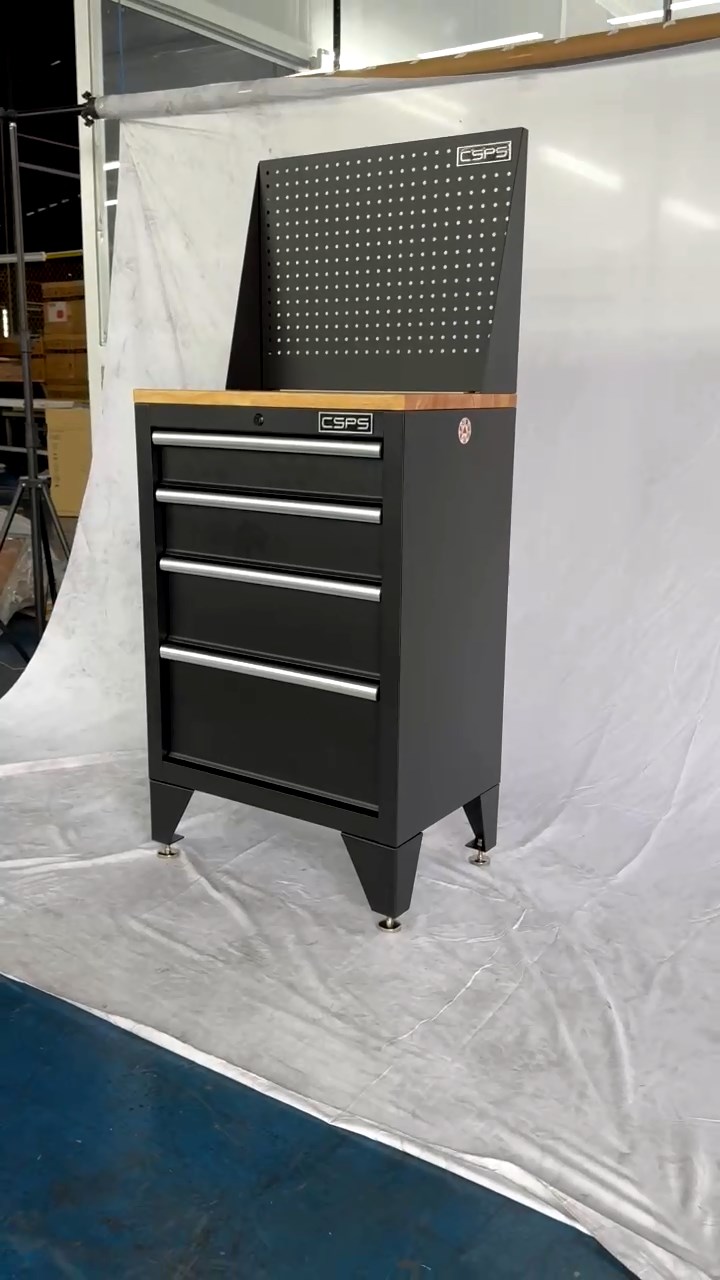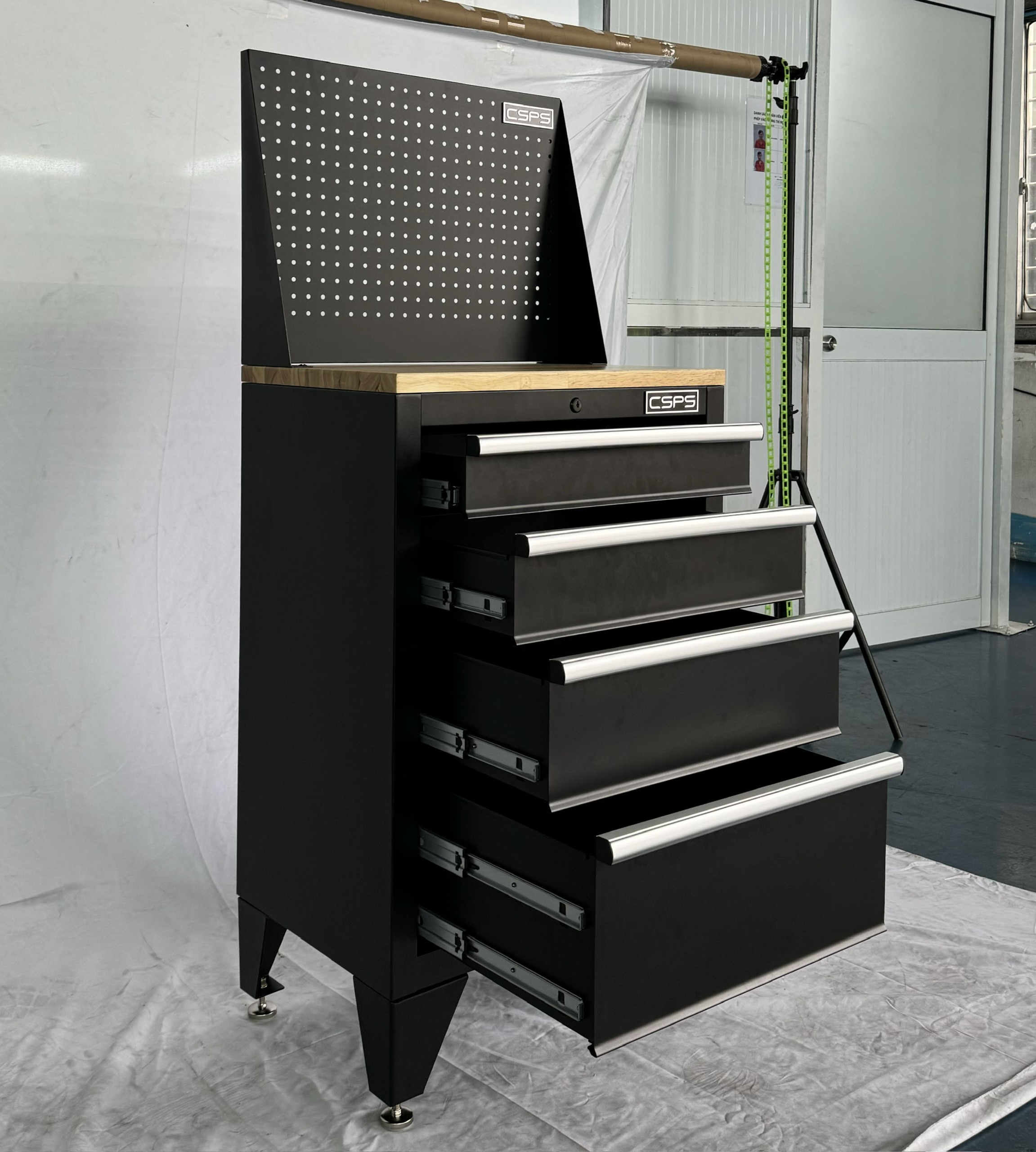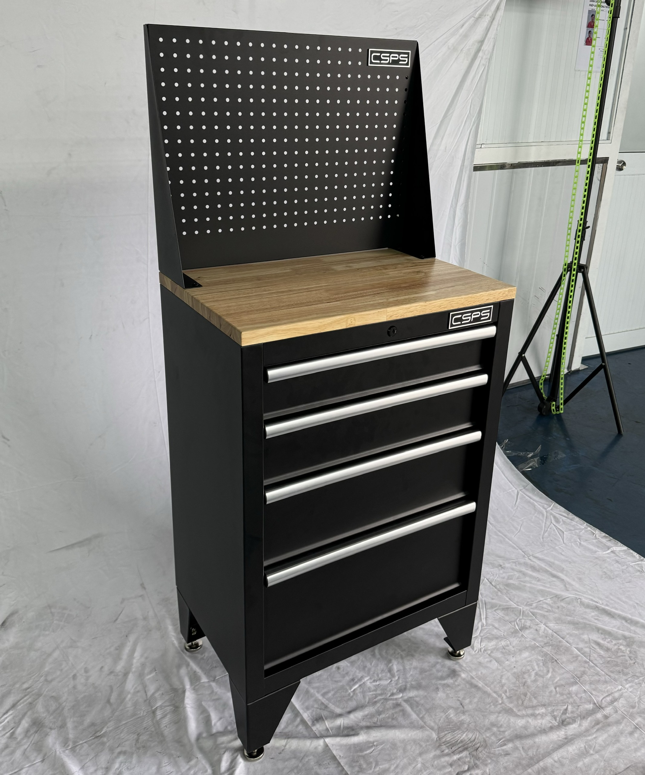 • Tủ dụng cụ CSPS 61cm - 04 hộc kéo màu đen chân tủ ván gỗ vách lưới (tay cầm trắng)