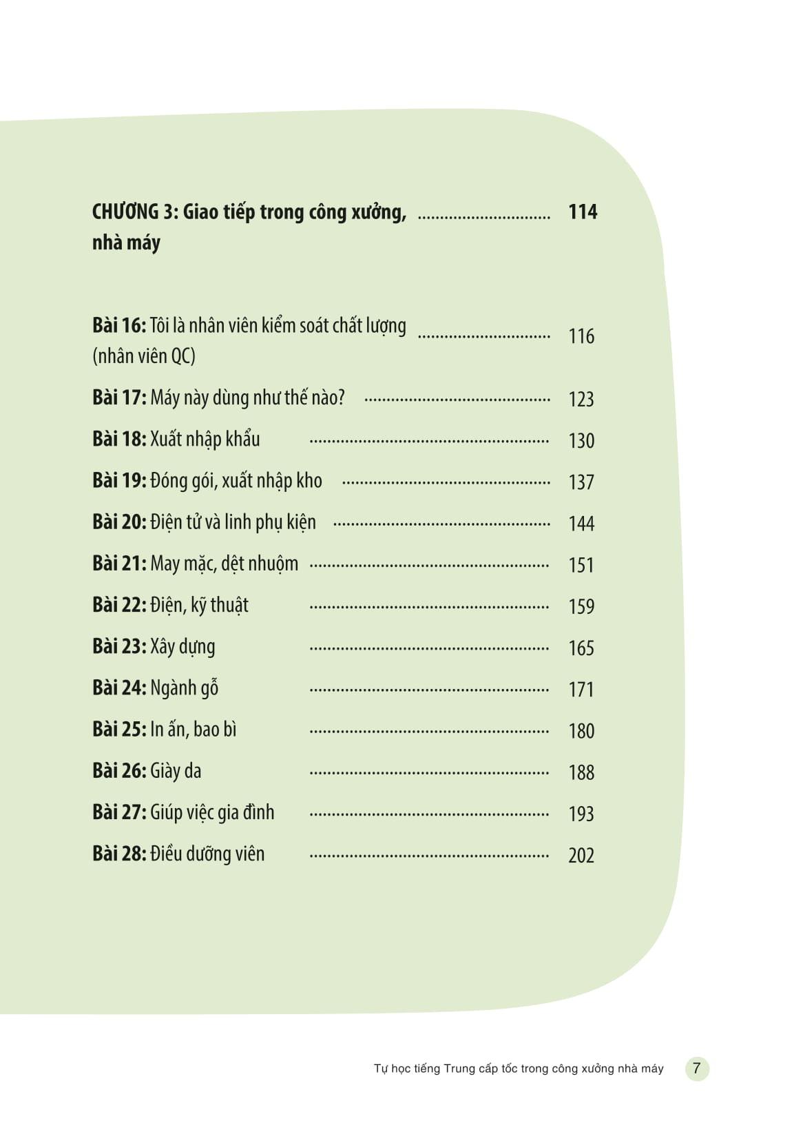 Cuốn sách “Tự học Tiếng Trung cấp tốc trong công xưởng, nhà máy” ra đời cũng vì mục đích đó. Với các chủ đề đa dạng, từ giao tiếp thông dụng tới giao tiếp theo chuyên ngành, cuốn sách sẽ phù hợp cho nhiều đối tượng khác nhau, đặc biệt là những người bận rộn muốn học tiếng Trung có trọng điểm, tiết kiệm thời gian và có thể ứng dụng ngay trong công việc.