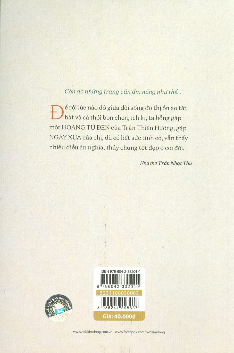 Để rồi lúc nào đó giữa đời sống đô thị ồn ào tất bật và cả thói bon chen, ích kỉ, ta bỗng gặp một HOÀNG TỬ ĐEN của Trần Thiên Hương, gặp NGÀY XƯA của chị, dù có hết sức tình cờ, vẫn thấy nhiều điều ân nghĩa, thủy chung tốt đẹp ở cõi đời.” - Nhà thơ Trần Nhật Thu