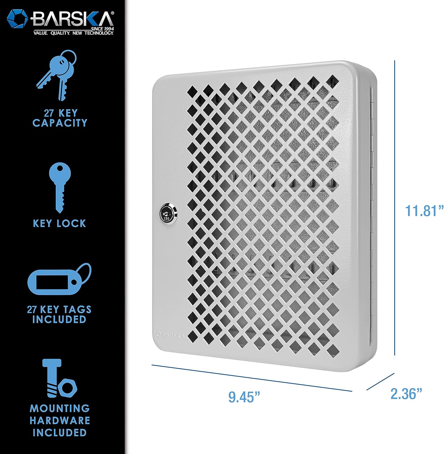 Tủ khóa mặt trước dạng lưới của Barska có tủ dạng móc giúp sắp xếp chìa khóa dễ dàng và tiện lợi. Bên trong tủ khóa này có ba hàng móc. Cửa dạng lưới cho phép nhận dạng ngay lập tức các móc rỗng. Các két an toàn có bốn lỗ lắp được khoan sẵn và phần cứng đi kèm để lắp đặt. Thành tủ và cửa được làm bằng thép đặc 0,8mm và được hoàn thiện bằng lớp phủ màu xám phẳng.
