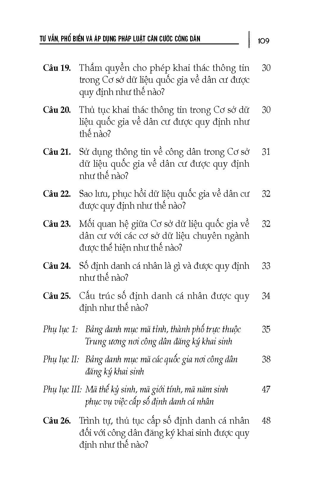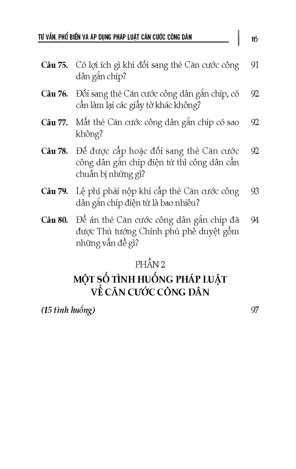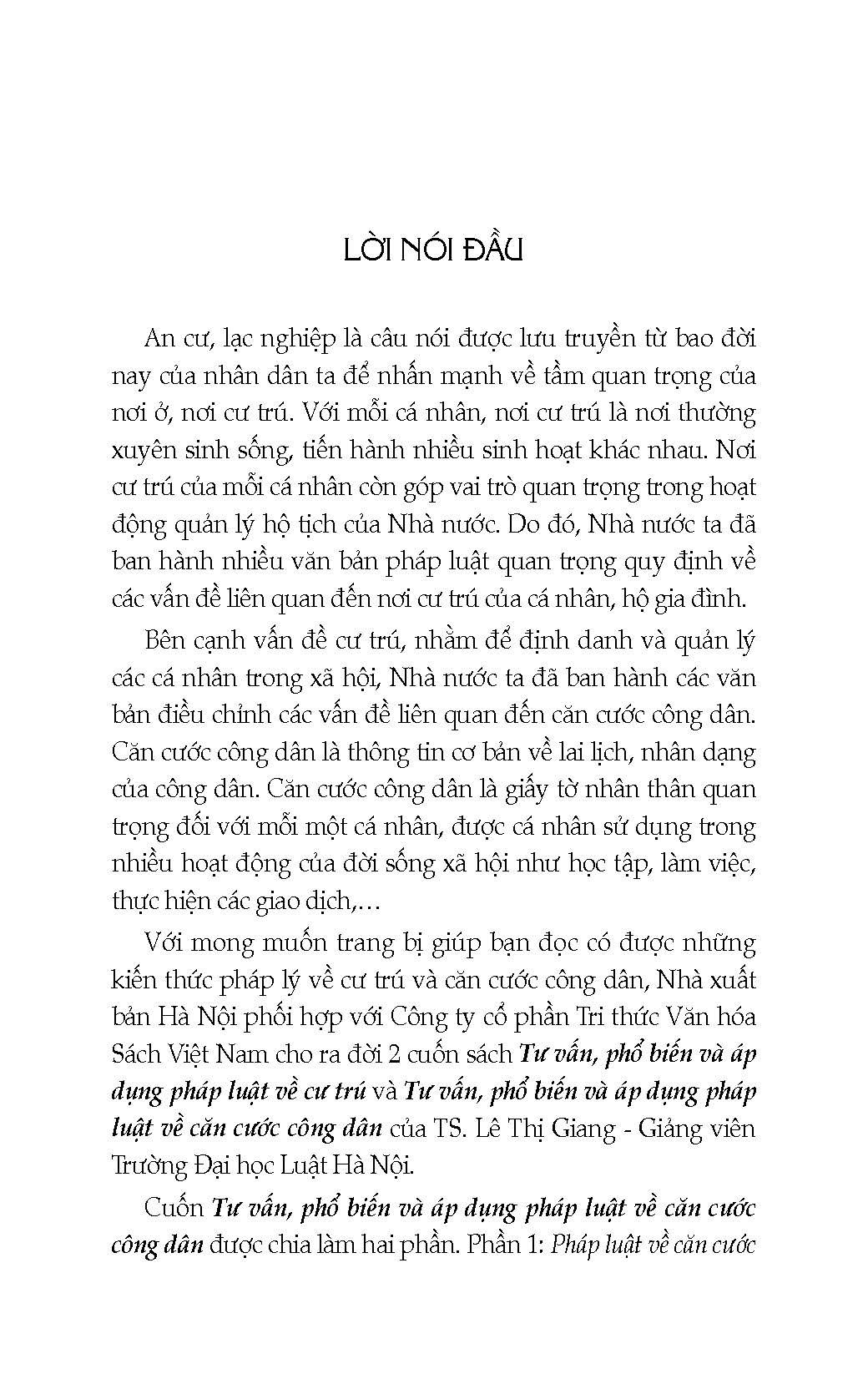 Cuốn Tư vấn, phổ biến và áp dụng pháp luật về căn cước công dân được chia làm hai phần. Phần 1: Pháp luật về căn cước công dân. Đồng thời để bạn đọc có thể hiểu rõ hơn cũng như áp dụng các quy định pháp luật về căn cước công dân, tác giả đã biên soạn các tình huống pháp lý về căn cước công dân tại phần 2 của cuốn sách. Những tình huống này phát sinh phổ biến mà bất cứ cá nhân, hộ gia đình nào cũng có thể gặp phải trong thực tiễn.