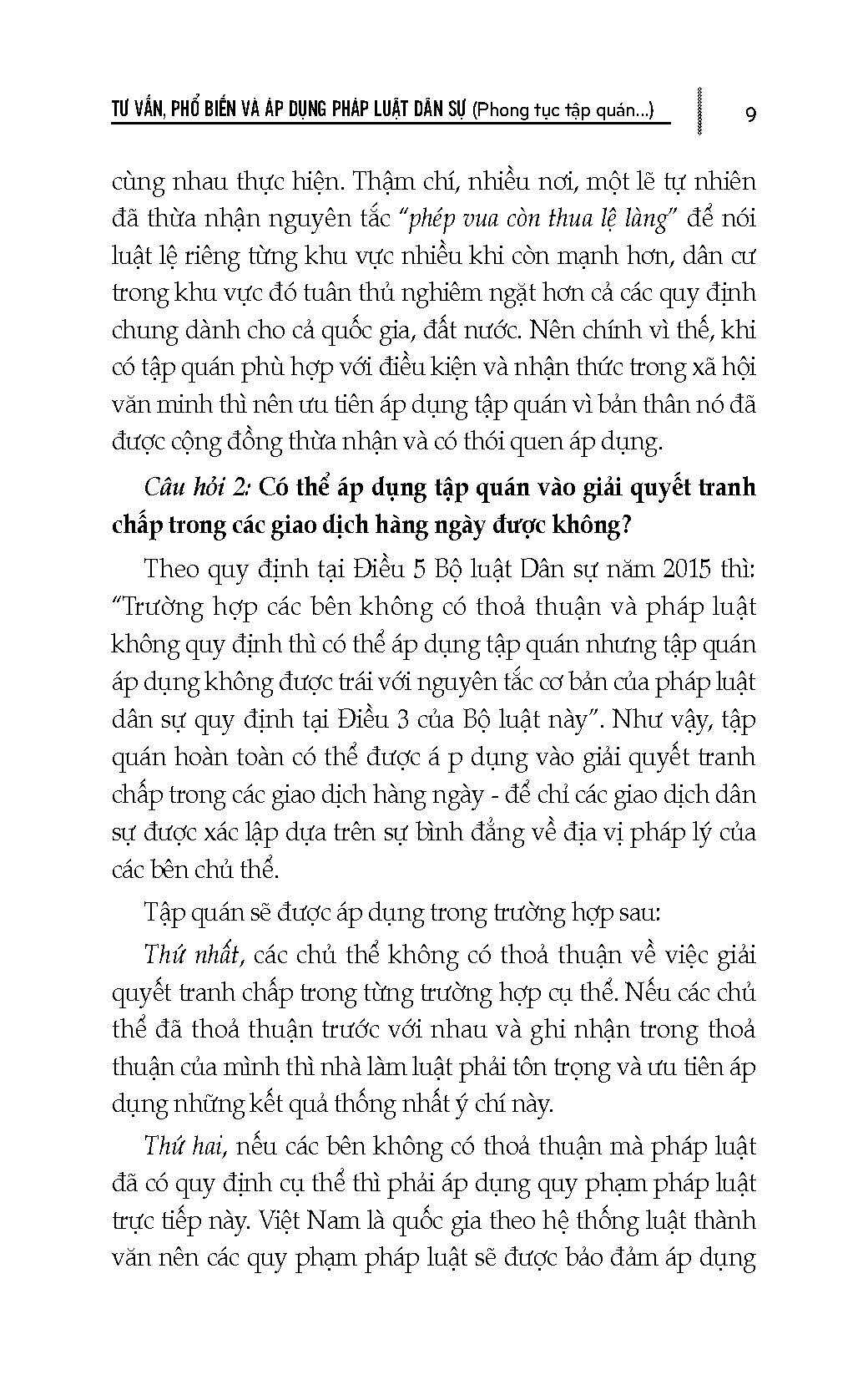 Cuốn sách trọng tâm giới thiệu về tập quán được pháp luật thừa nhận với tư cách là một nguồn quan trọng trong giải quyết các tranh chấp phát sinh. Thông qua các tình huống, câu hỏi, tác giả muốn giới thiệu những khía cạnh lý luận, làm rõ các điều kiện pháp luật đặt ra để áp dụng tập quán cũng như cho thấy vai trò tập quán trong quá trình giải quyết các tranh chấp của đời sống con người, đặc biệt những tranh chấp dân sự phát sinh trong đời sống hàng ngày. Đồng thời, tác giả cũng đưa ra các khía cạnh để đối sánh giữa tập quán với phong tục, luật tục, thói quen ứng xử.