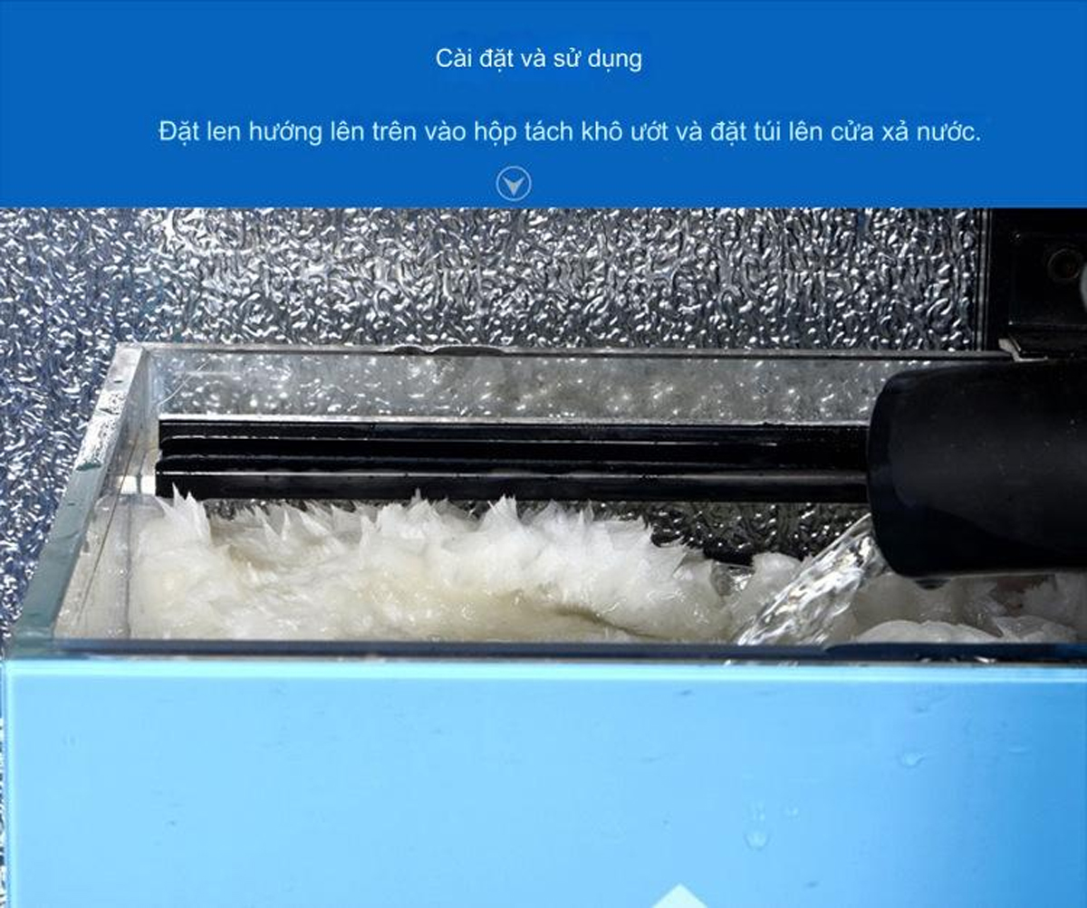 - Túi lọc có quai nhựa dễ dàng thao tác chỉ cần gác túi lọc vào đường ống máy bơm nước vào hộp lọc tràn trên hoặc đường ống hút đáy.