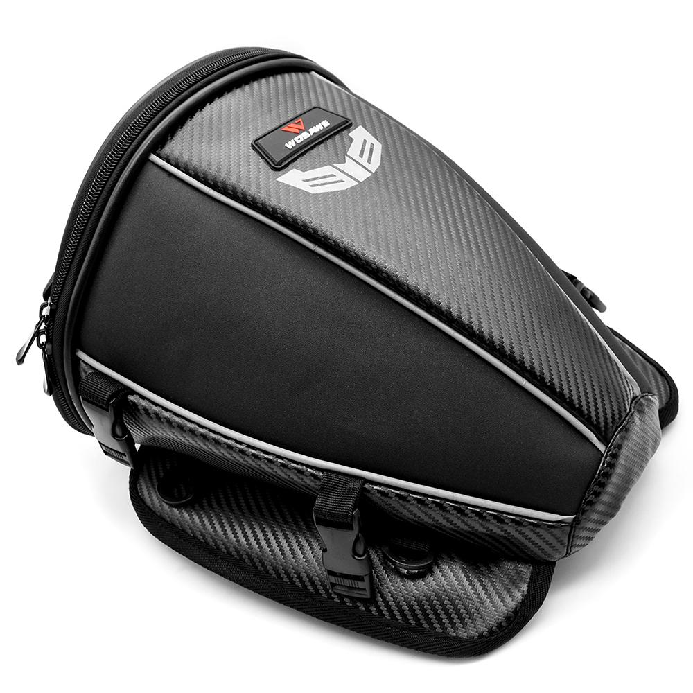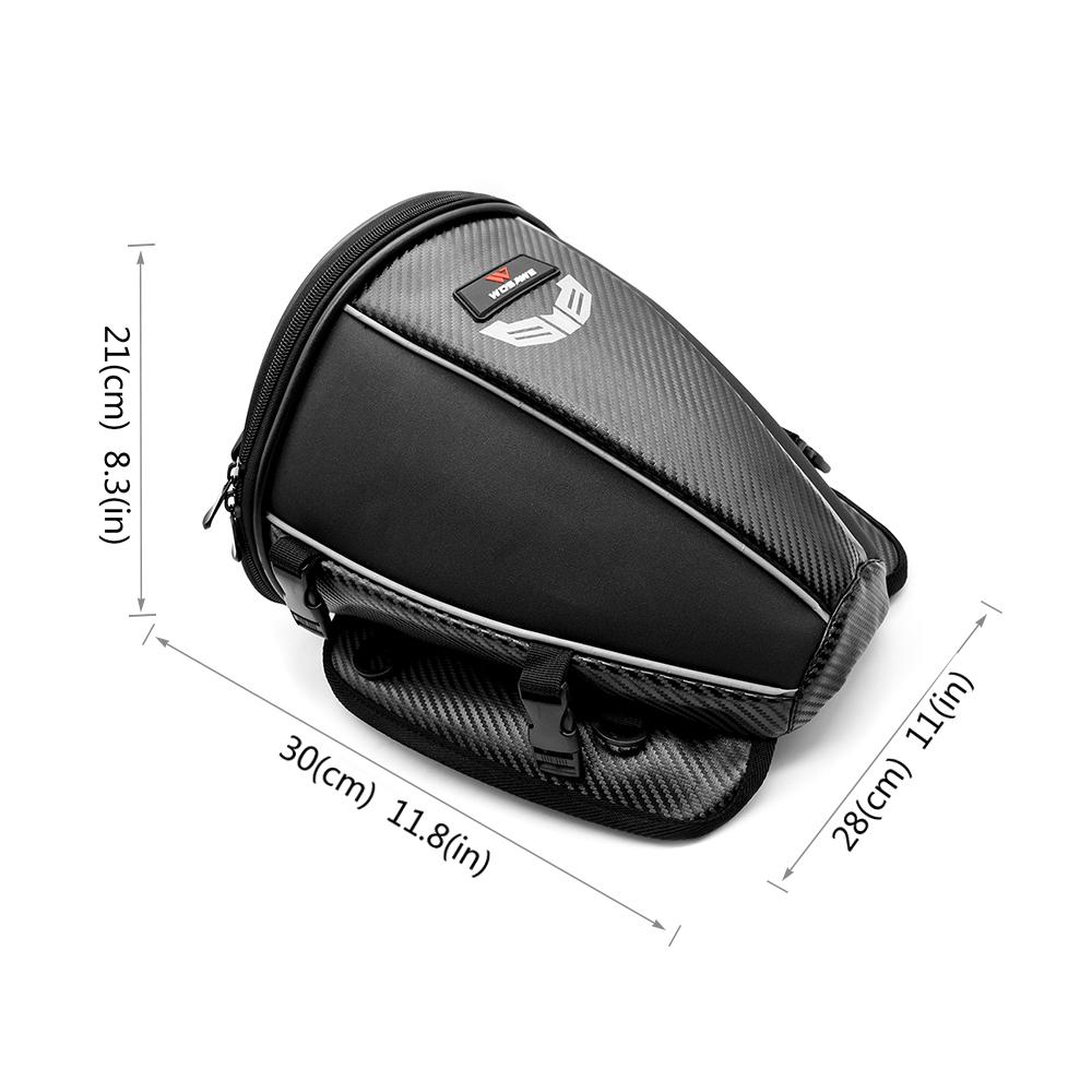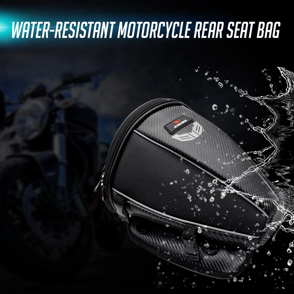 Made with high-quality polyester and PU material, this bag is water-resistant and wear-resistant. It features highly visible reflective piping, and self-adjusting buckle for easy mounting on the rear seat of your motorcycle. With 15L capacity,