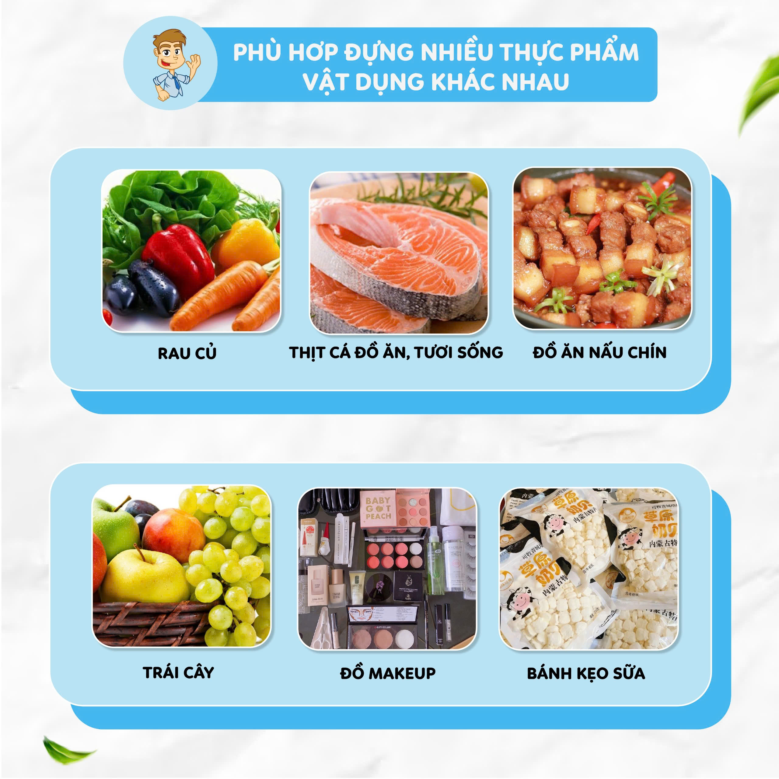 Chất liệu PE/PET cao cấp – An toàn cho thực phẩm → Đạt tiêu chuẩn an toàn vệ sinh thực phẩm. → Có thể dùng đựng đồ ăn chín, sống, rau củ, trái cây... Khóa zip chắc chắn – Kín hơi, chống tràn tuy...