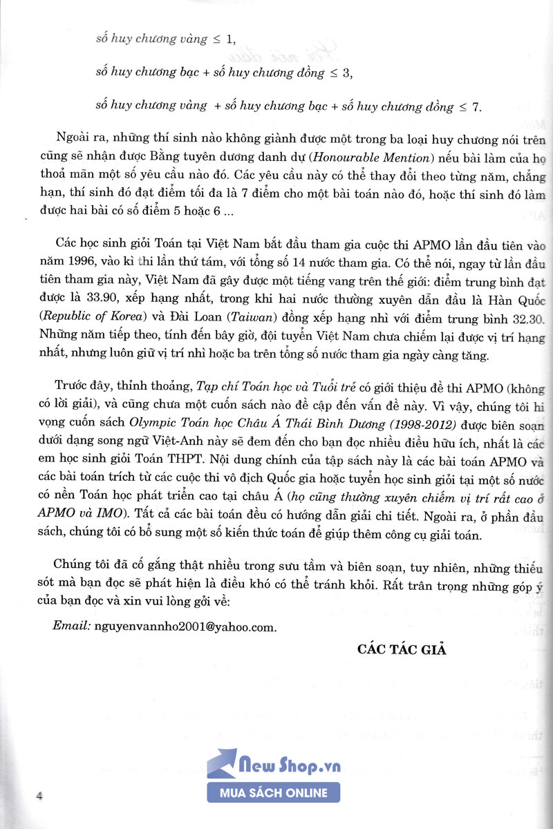 Tuyển Tập Olympic Toán Tại Các Nước Châu Á - Thái Bình Dương được biên soạn dưới dạng song ngữ Việt – Anh này sẽ đem đến cho bạn đọc nhiều điều hữu ích, nhất là các em học sinh giỏi Toán THPT. Nội dung chính của tập sách này là các bài toán APMO và các bài toán trích từ các cuộc thi vô địch Quốc gia hoặc tuyển chọn học sinh giỏi tại một số nước có nền Toán học phát triển cao tại châu Á.