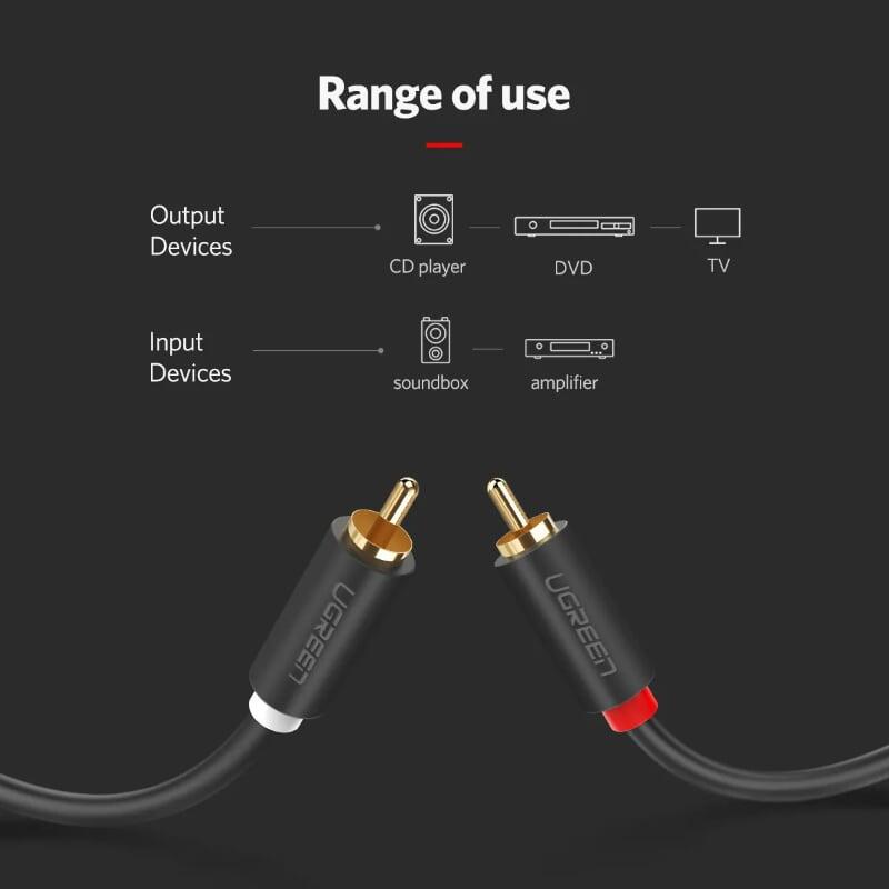 - Cáp Chuyển Đổi Ugreen 3.5mm Sang 2 RCA 10511 (1.5m) được dùng để kết nối từ điện thoại, máy tính, máy nghe nhạc… đến các thiết bị âm thanh có chuẩn RCA (hoa sen)