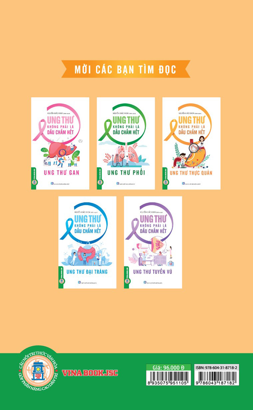 Mua tại TiktokBộ sách Ung thư không phải là dấu chấm hết gồm 5 quyển. Mỗi quyển là một sự tìm hiểu mỗi chứng bệnh ung thư khác nhau: Gan, Phổi, Thực quản, Đại tràng, tuyến vú; cung cấp những kiến thức cơ bản cần thiết nhằm giúp chúng ta chủ động phòng chống và chiến thắng bệnh tật. Ung thư thực quản giúp chúng ta tìm hiểu nguyên nhân dẫn tới bệnh, nguyên tắc và phương pháp điều trị bệnh ung thư thực quản như: phương pháp phẫu thuật điều trị, phương pháp hóa chất, điều trị bằng thuốc Đông y, phương cách điều dưỡng bệnh nhân bằng thức ăn, một số việc nên làm để phòng bệnh,…