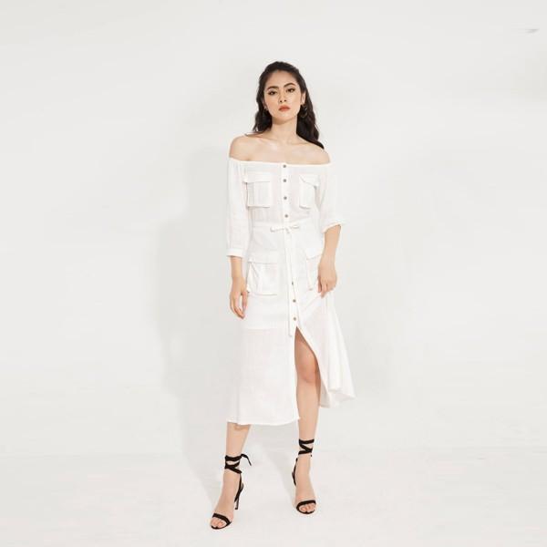 Mua tại TiktokVáy trễ vai linen cúc dừa