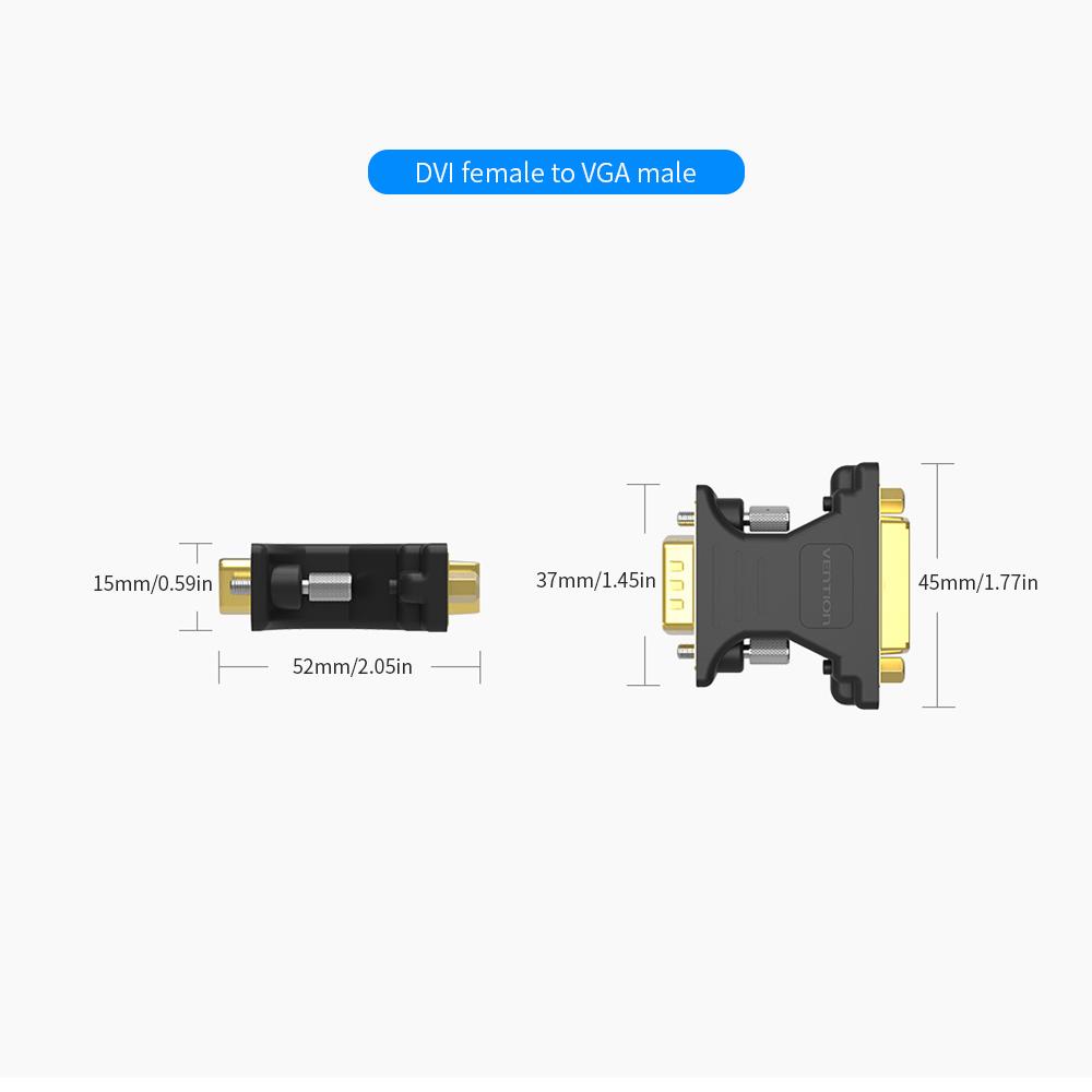 VENTION DVI to VGA Adapter is a device for connecting a device outputs DVI videoto a display that only uses VGA inputs. It can be used with devices such asprojectors for presentations and movies. Features: Powerful performance and fluent switch. Don't worry about your computer hostdoes not have VGA interface. Wide compatibility. Support devices with DVI(24+5) interface, such as laptop,displayer, projector. Do not support DVI(24+1) and DVI(18+1). 1080P high definition transmission. Support 1920x1080@60Hz resolution. Dual securing nut and gold-plated interface ensure a sturdy connection anddurable use as well as stable transmission. Specification: Color: Black Interface type: DVI (24+5) female, VGA male Interface process: Gold-plated Jacket material: PVC Resolution: 1920x1080@60Hz Transmission direction: DVI input, VGA output Item size: 4.2 3.7 1.5cm / 1.6 1.5 0.6in(L W H) Item weight: Approx.31g / 1.09oz Package size: 10 10 5cm / 3.94 3.94 1.97in(L W H) Package weight: 31g / 1.09oz Package list: 1 * DVI to VGA Adapter