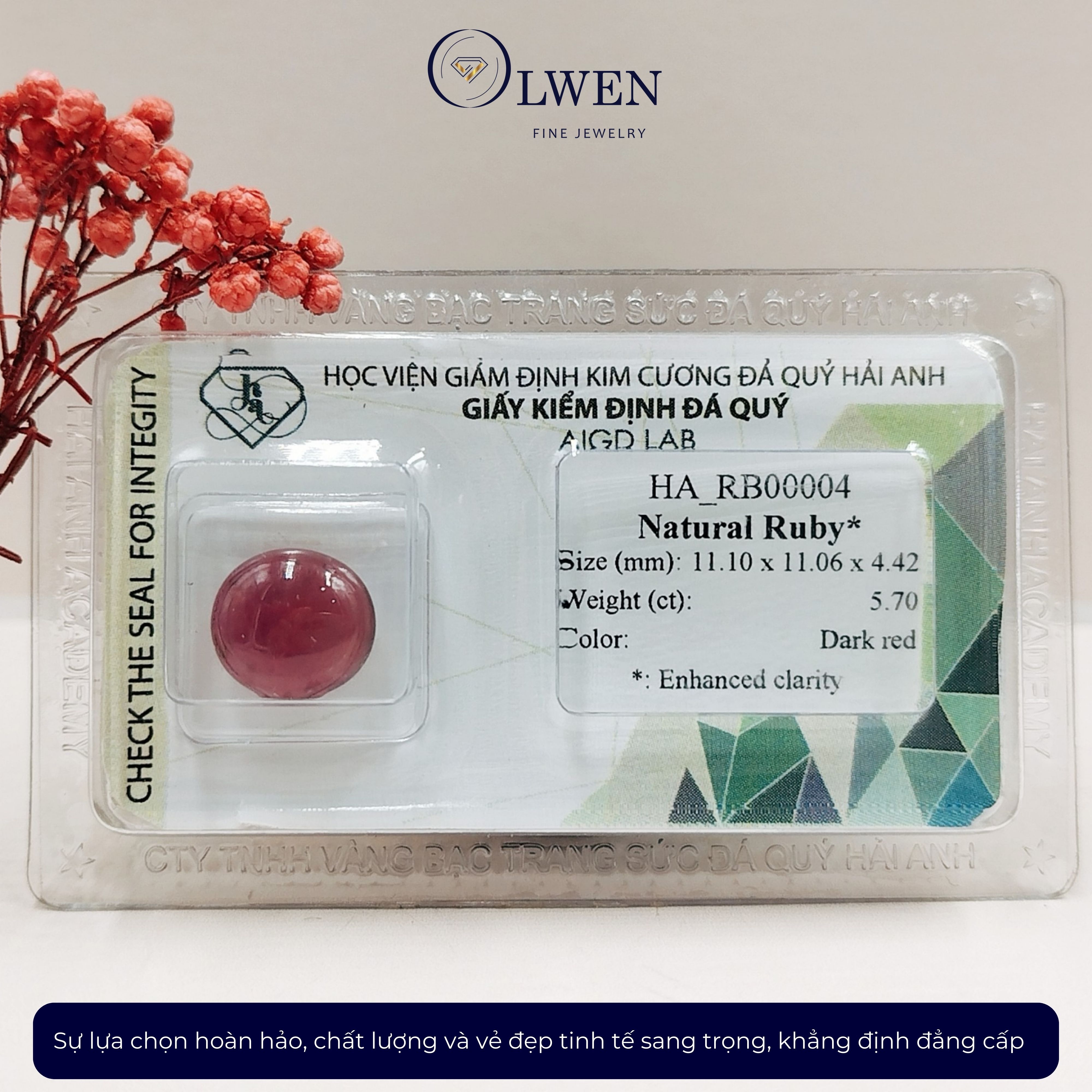 Mua tại TiktokVIÊN ĐÁ RUBY THIÊN NHIÊN_HA-RB00004 Tên sản phẩm: Viên đá Ruby thiên nhiên _HA-RB00004, đá phong thủy. Kích thước: 11.10 x 11.06 x 4.42 mm Trọng lượng: 5.70 cts Màu sắc: đỏ đậm CÔNG DỤNG CỦA MẶT RUBY Là một trong những loại đá hoàn hảo nhất, đá ruby (hồng ngọc) tượng trưng cho Mặt Trời, quyền lực, tự do, may mắn và vui vẻ. Nếu đeo gần tim thì viên đá này sẽ giúp cho tình yêu của bạn thêm mặn nồng. Ngoài ra nó còn giúp lưu thông máu và giúp ngủ ngon.