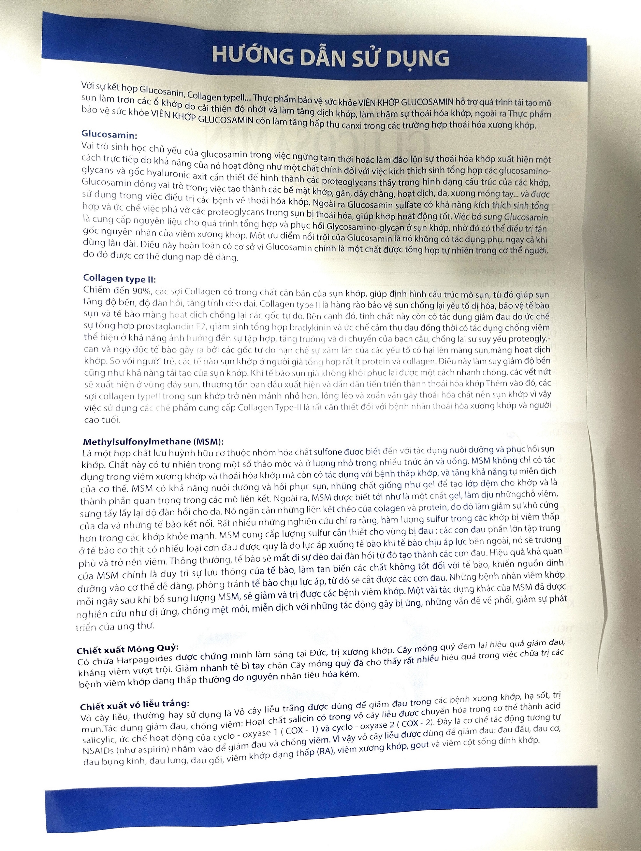Thành phần : Trong mỗi viên nén có chứa: - Glucosamin sulphate 2 NaCl 750mg. - MSM (Methysulfonylmethane) 50mg, Calci gluconate 100mg, Cao xương ngựa bạch 70mg, Chondroitin sulphate 50mg, Collagen type II 30mg, sụn
