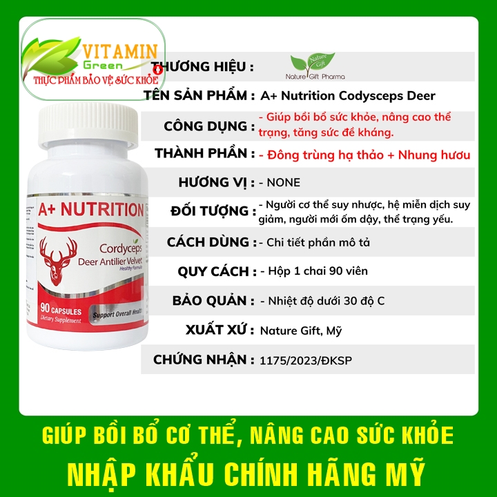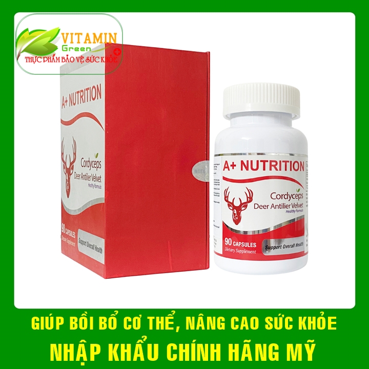 A+ Nutrition Codysceps Deer là thực phẩm bảo vệ sức khỏe được nhập khẩu chính hãng từ Mỹ, A+ Nutrition Codysceps Deer với công thức vàng kết hợp Đông trùng hạ thảo và Nhung hưu tạo nên 1 sản phẩm cao cấp mang lại nhiều lợi ích cho sức khỏe, giúp tăng cường sức đề kháng, Bổ sung dưỡng chất thiết yếu, giúp cơ thể chống lại các tác nhân gây bệnh từ bên ngoài, giúp bạn luôn tràn đầy năng lượng cho ngày dài hoạt động. Ngoài ra còn giúp tăng cường trí nhớ và khả năng tập trung. A+ Nutrition Codysceps Deer  với nồng độ chiết xuất hóa 100% theo tiêu chuẩn Mỹ: Đảm bảo chất lượng và hiệu quả tối ưu. Hàm lượng 500mg Nhung Hươu cao Cung cấp dưỡng chất quý giá cho sức khỏe. 100% sản xuất và nhập khẩu trực tiếp từ Mỹ: Đạt chứng nhận FDA, đảm bảo an toàn và chất lượng CÔNG DỤNG CỦA A+ Nutrition Codysceps Deer :