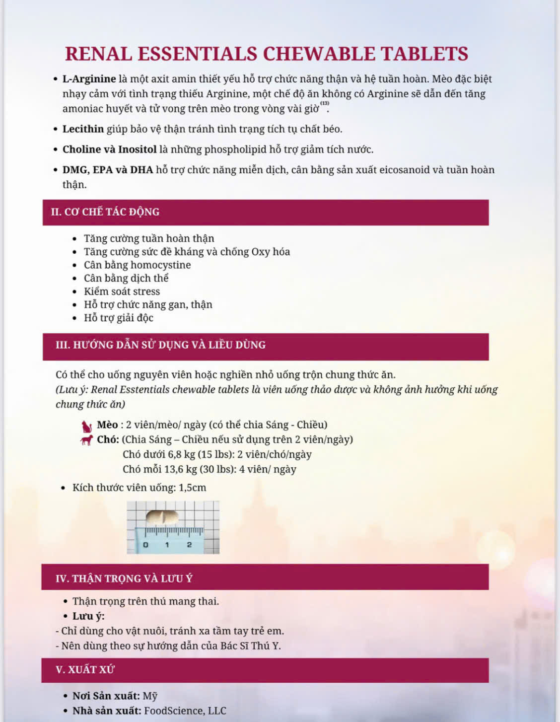 Sản phẩm được dùng trong các trường hợp: Tăng cường chức năng thận. Hỗ trợ cải thiện tuần hoàn máu đến thận. Duy trì chức năng tế bào. Chó và mèo
